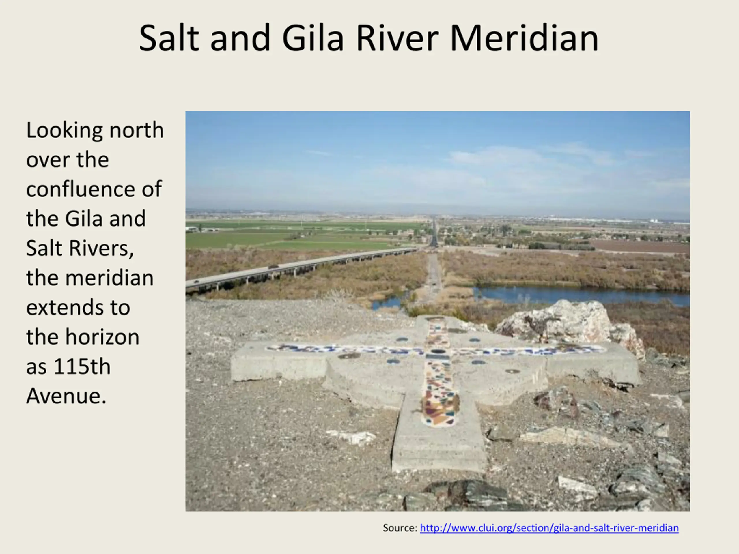 Salt and Gila River Meridian Looking north over the confluence of the Gila and Salt Rivers, the meridian extends to the horizon as 115th Avenue. Source: http://www.clui.org/section/gila-and-salt-river-meridian