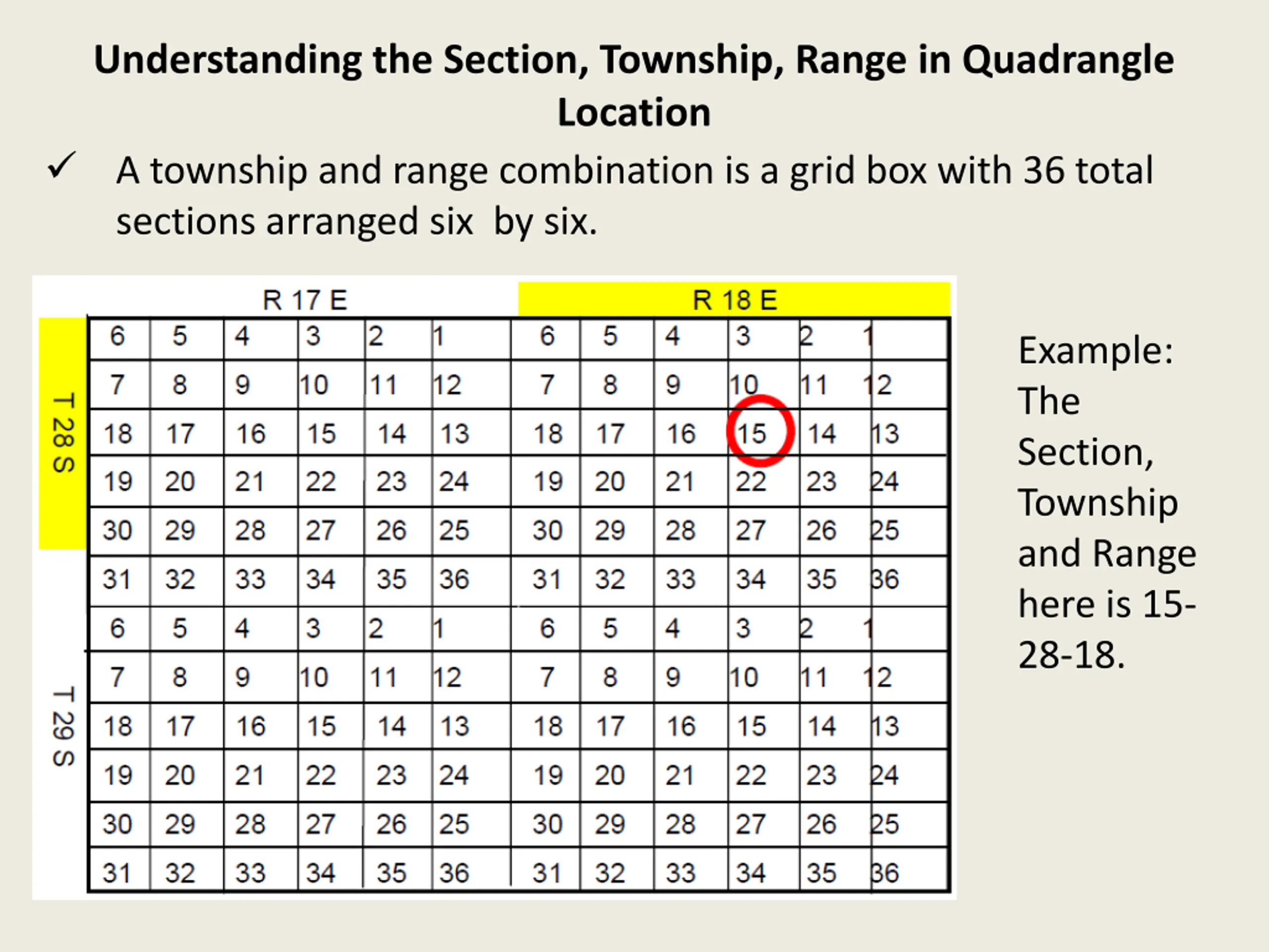 Understanding the Section, Township, Range in Quadrangle Location A township and range combination is a grid box with 36 total sections arranged six by six. Example: The Section, Township and Range here is 15- 28-18.