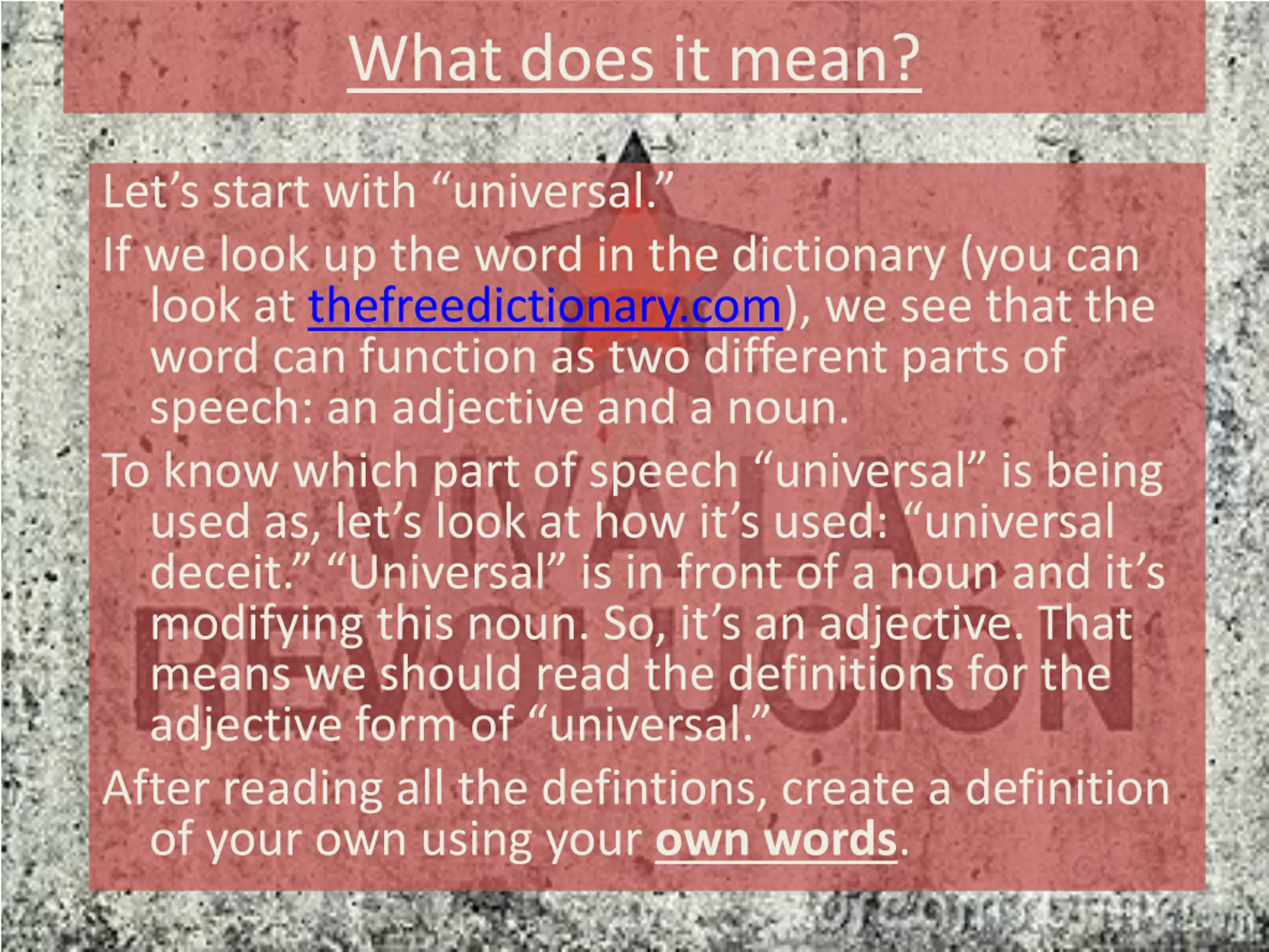 What does it mean? Let s start with universal. If we look up the word in the dictionary (you can look at thefreedictionary.com), we see that the word can function as two different parts of speech: an adjective and a noun. To know which part of speech universal is being used as, let s look at how it s used: universal deceit. Universal is in front of a noun and it s modifying this noun. So, it s an adjective. That means we should read the definitions for the adjective form of universal. After reading all the defintions, create a definition of your own using your own words.