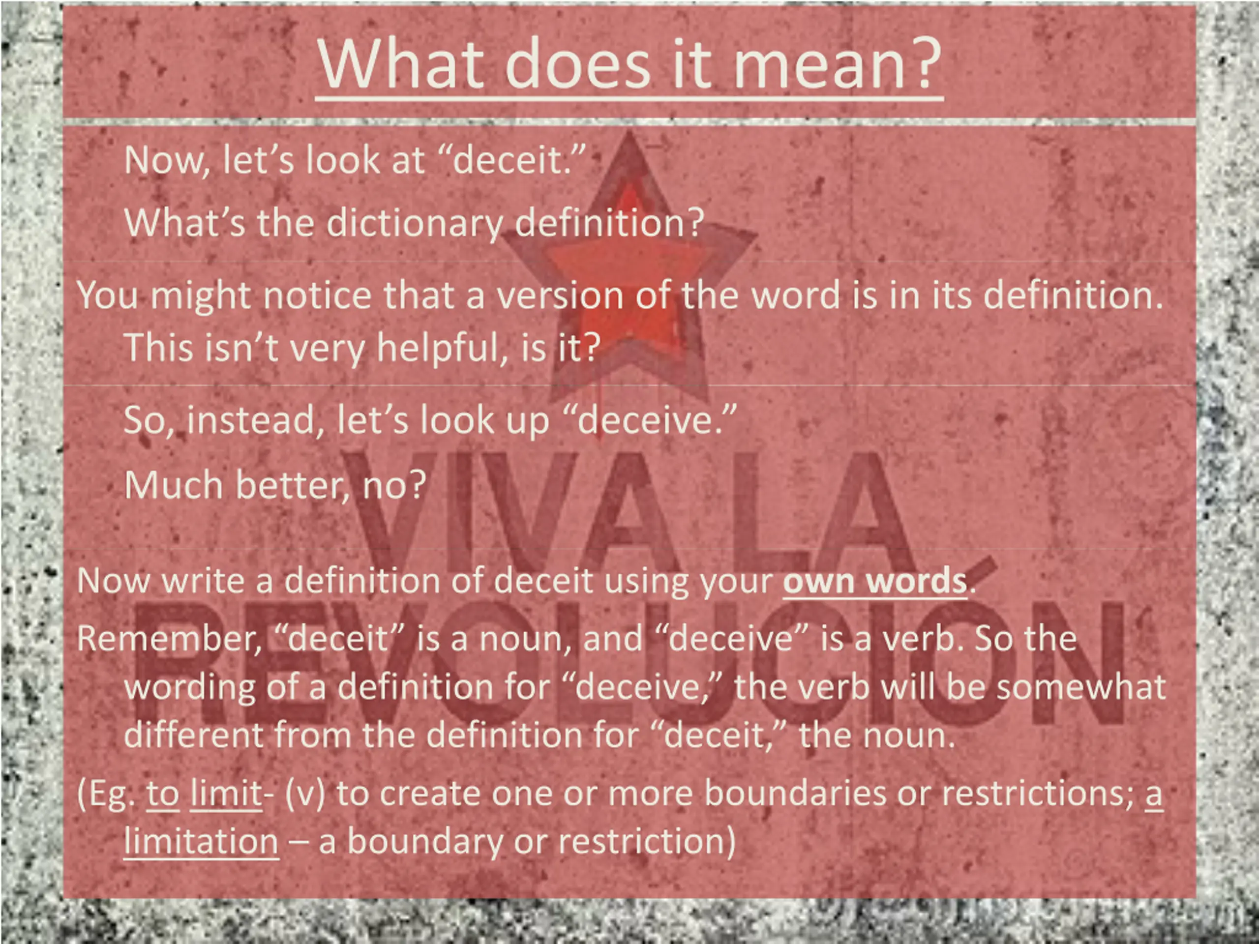 What does it mean? Now, let s look at deceit. What s the dictionary definition? You might notice that a version of the word is in its definition. This isn t very helpful, is it? So, instead, let s look up deceive. Much better, no? Now write a definition of deceit using your own words. Remember, deceit is a noun, and deceive is a verb. So the wording of a definition for deceive, the verb will be somewhat different from the definition for deceit, the noun. (Eg. to limit- (v) to create one or more boundaries or restrictions; a limitation a boundary or restriction)