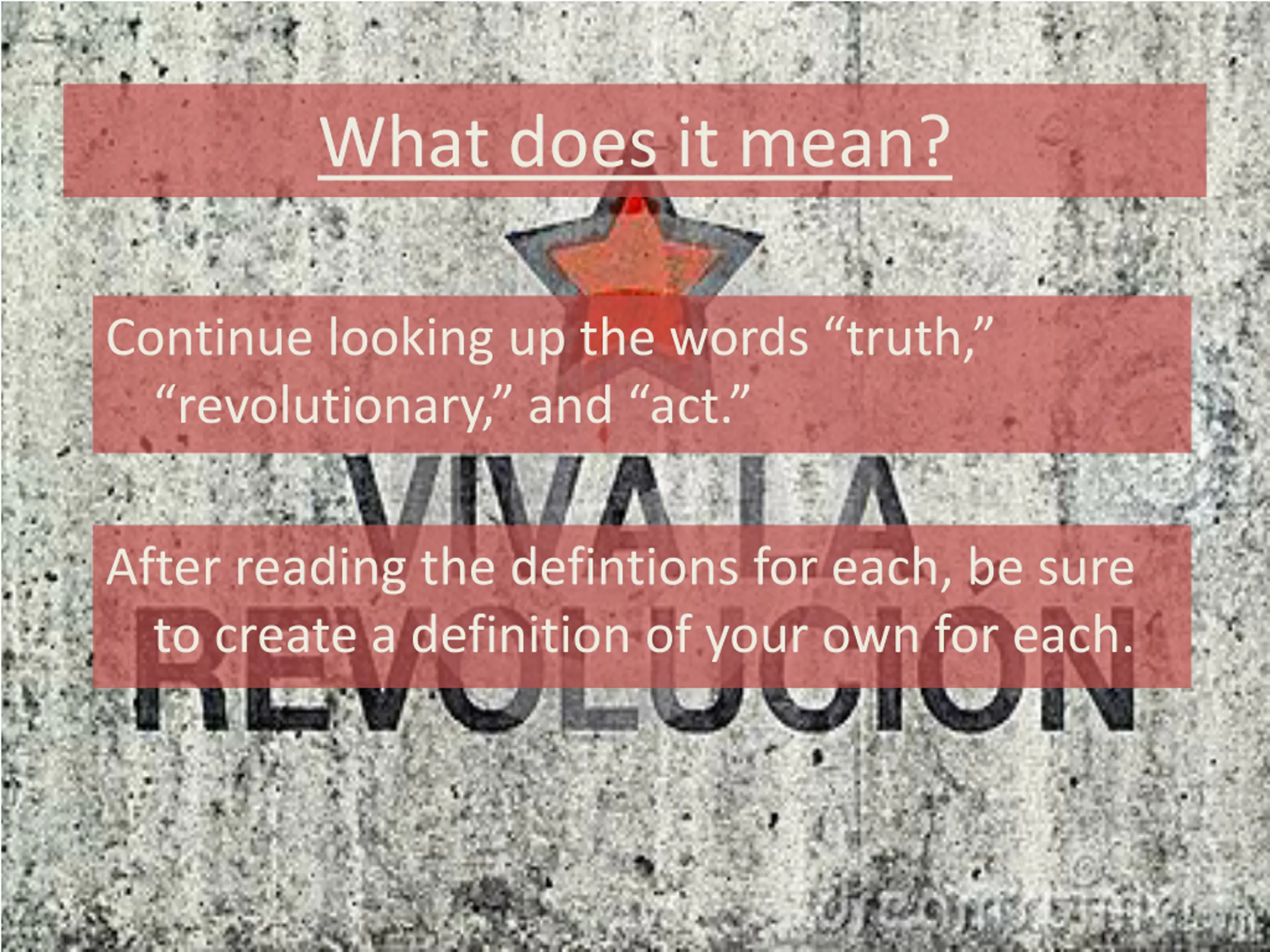 What does it mean? Continue looking up the words truth, revolutionary, and act. After reading the defintions for each, be sure to create a definition of your own for each.