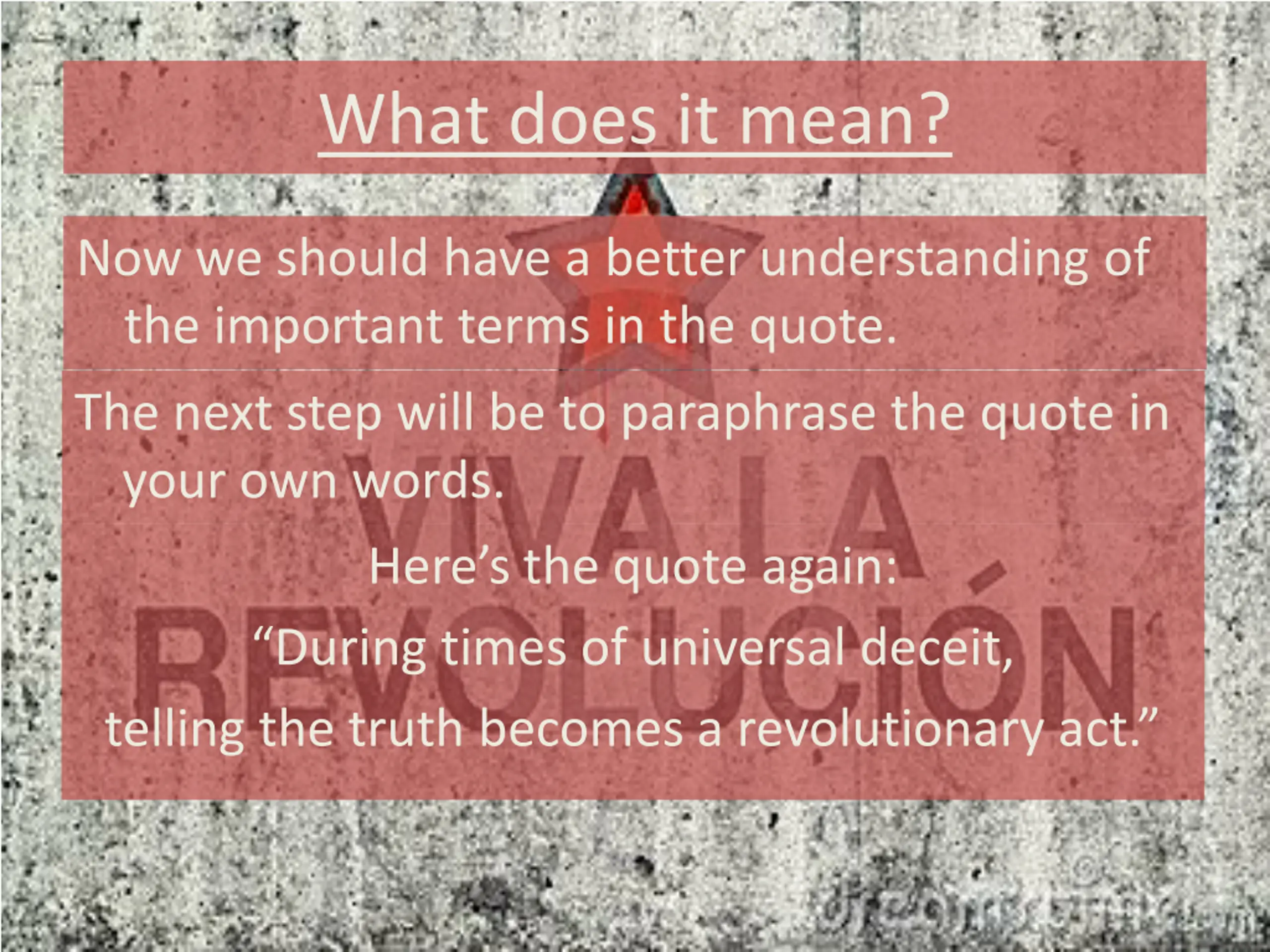 What does it mean? Now we should have a better understanding of the important terms in the quote. The next step will be to paraphrase the quote in your own words. Here s the quote again: During times of universal deceit, telling the truth becomes a revolutionary act.
