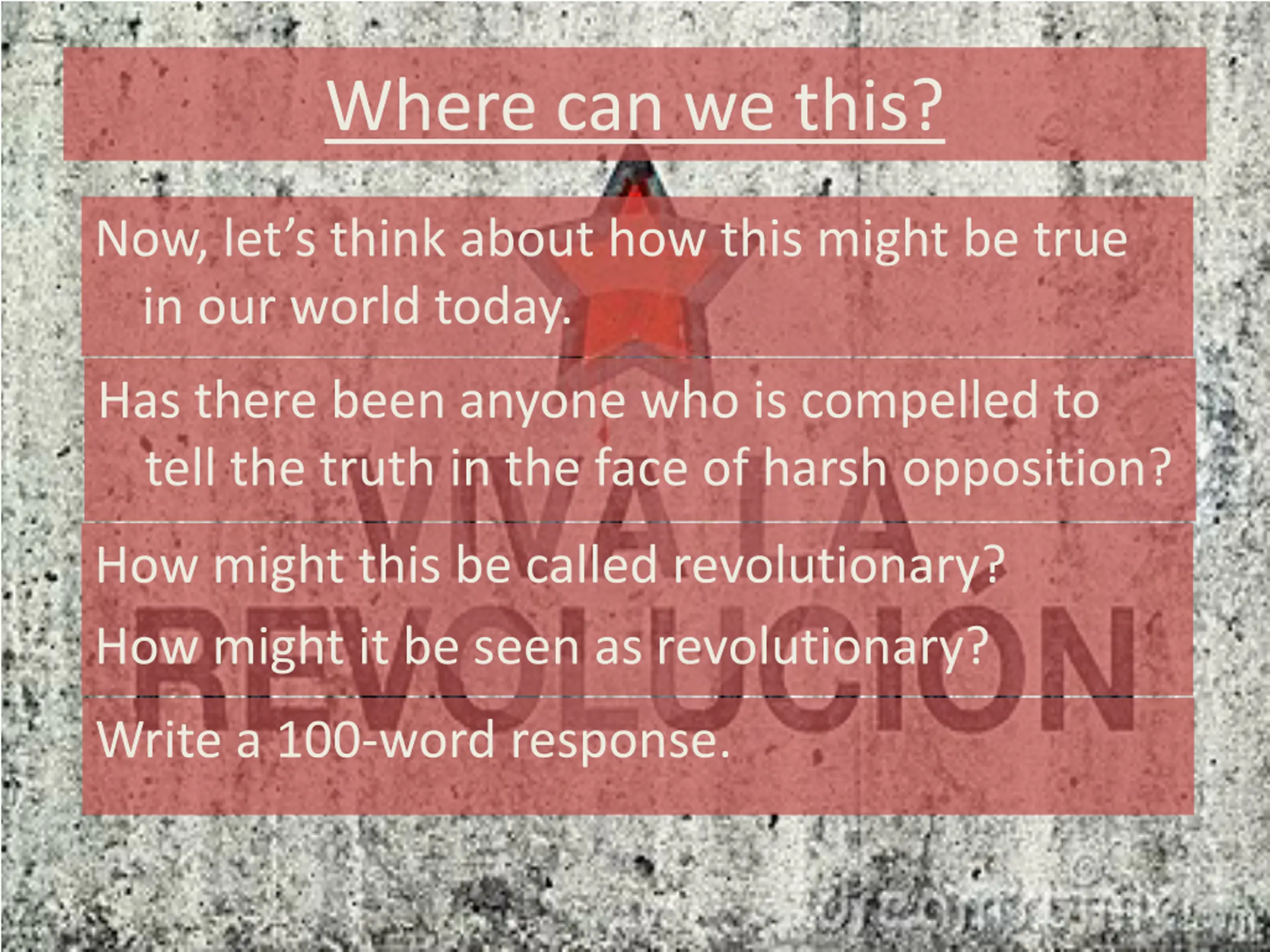 Where can we this? Now, let s think about how this might be true in our world today. Has there been anyone who is compelled to tell the truth in the face of harsh opposition? How might this be called revolutionary? How might it be seen as revolutionary? Write a 100-word response.