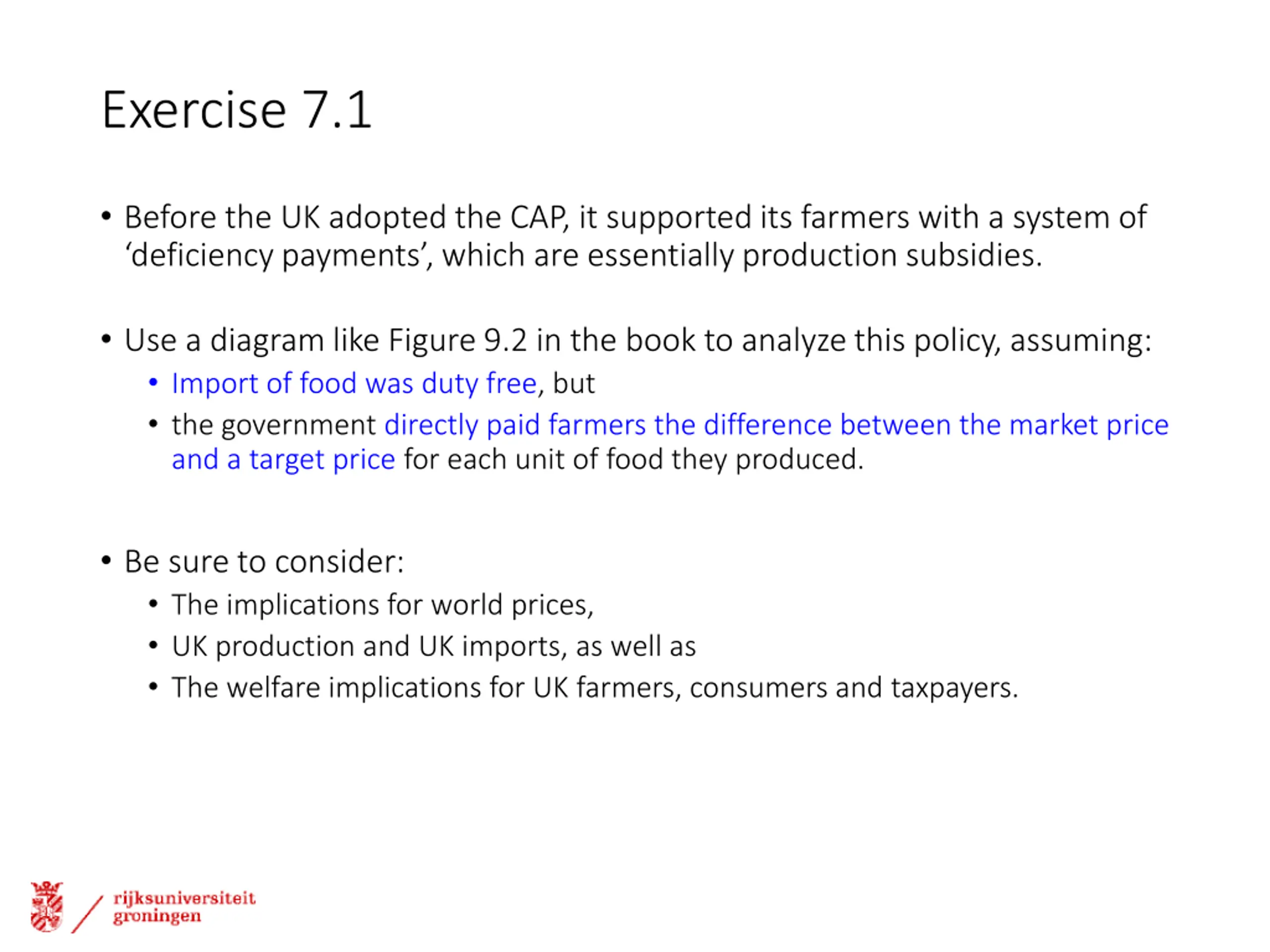 Exercise 7.1 Before the UK adopted the CAP, it supported its farmers with a system of deficiency payments , which are essentially production subsidies. Use a diagram like Figure 9.2 in the book to analyze this policy, assuming: Import of food was duty free, but the government directly paid farmers the difference between the market price and a target price for each unit of food they produced. Be sure to consider: The implications for world prices, UK production and UK imports, as well as The welfare implications for UK farmers, consumers and taxpayers.