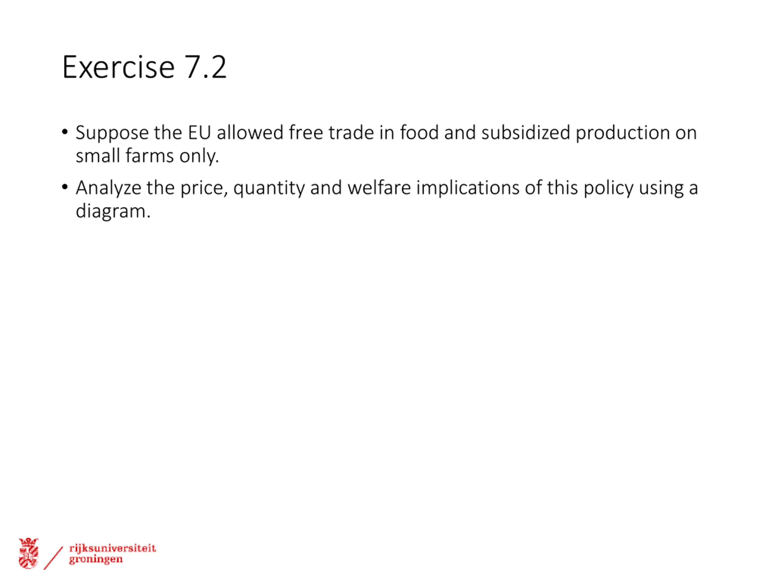 Exercise 7.2 Suppose the EU allowed free trade in food and subsidized production on small farms only. Analyze the price, quantity and welfare implications of this policy using a diagram.