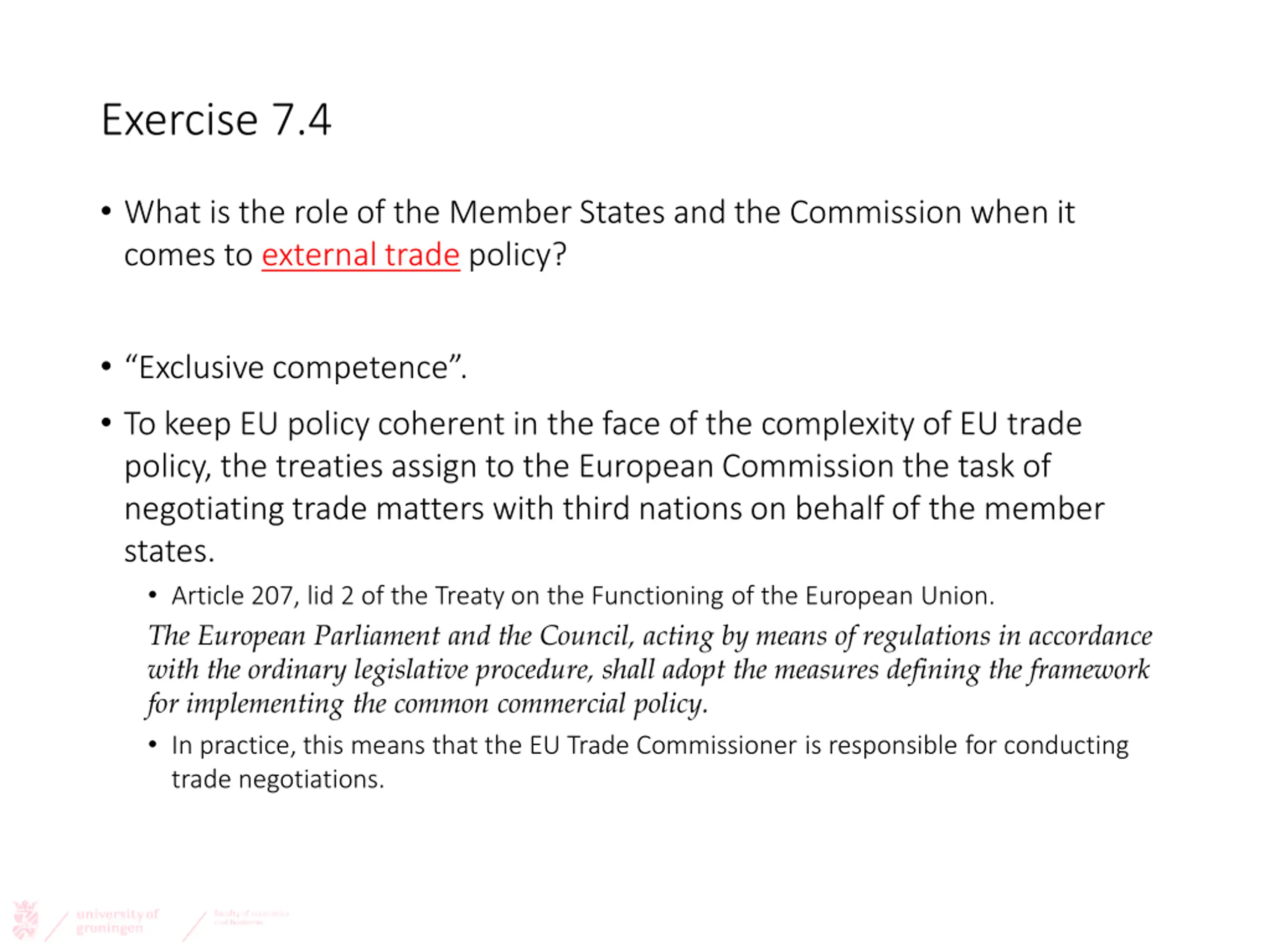 Exercise 7.4 Answer What is the role of the Member States and the Commission when it comes to external trade policy? Exclusive competence . To keep EU policy coherent in the face of the complexity of EU trade policy, the treaties assign to the European Commission the task of negotiating trade matters with third nations on behalf of the member states. Article 207, lid 2 of the Treaty on the Functioning of the European Union. The European Parliament and the Council, acting by means of regulations in accordance with the ordinary legislative procedure, shall adopt the measures defining the framework for implementing the common commercial policy. In practice, this means that the EU Trade Commissioner is responsible for conducting trade negotiations.