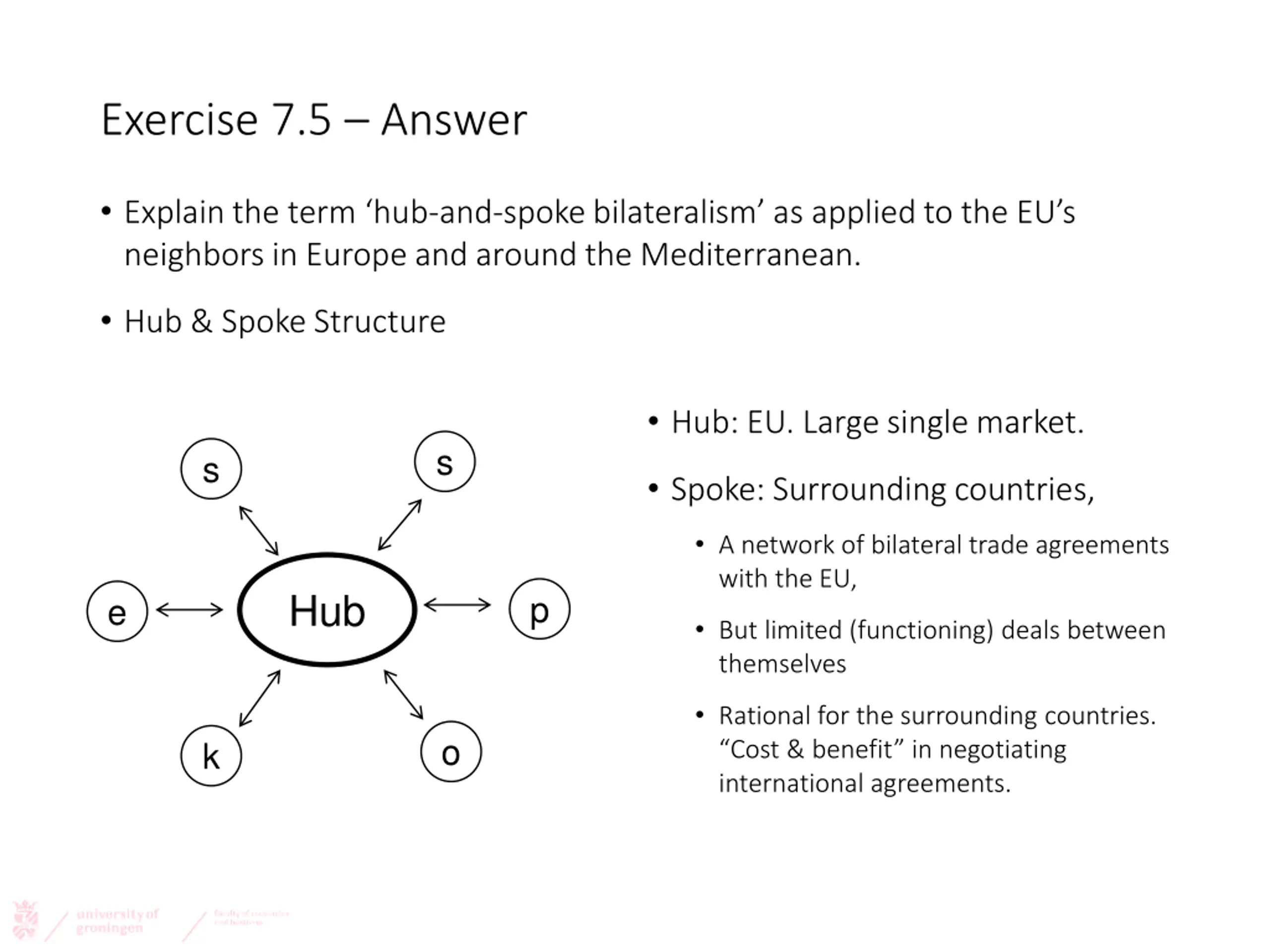 Exercise 7.5 Answer Explain the term hub-and-spoke bilateralism as applied to the EU s neighbors in Europe and around the Mediterranean. Hub & Spoke Structure Hub: EU. Large single market. s s Spoke: Surrounding countries, A network of bilateral trade agreements with the EU, Hub p e But limited (functioning) deals between themselves Rational for the surrounding countries. Cost & benefit in negotiating international agreements. o k