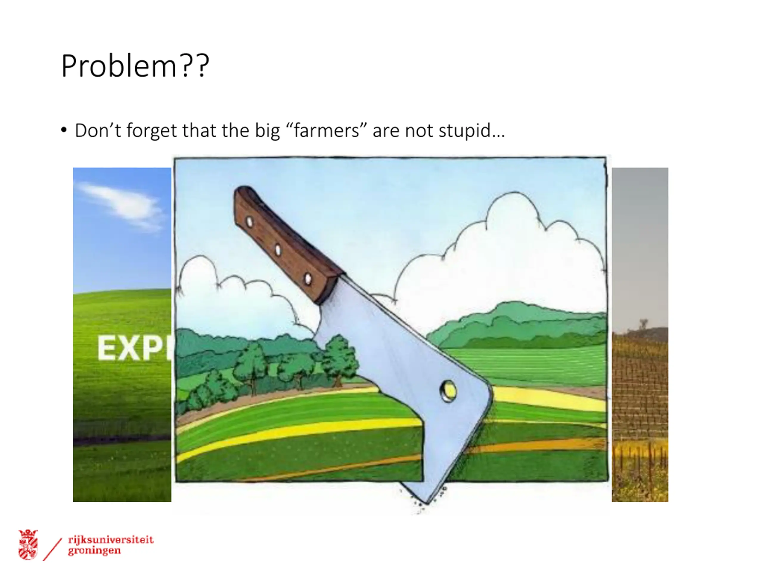 Cap on maximum subsidy Small farms unaffected. Big farms earns a lower price per unit of output, when the maximum of has been reached. (i.e. without subsidy) Big farms supply exactly the amount of output that make full use of the 300 thousand subsidy (and stop there). P + Subsidy max Subs. Price faced by large farms Small unaffected, Big is smaller in scale, So relatively: inequality between two farms is now smaller. P Z 300,000
