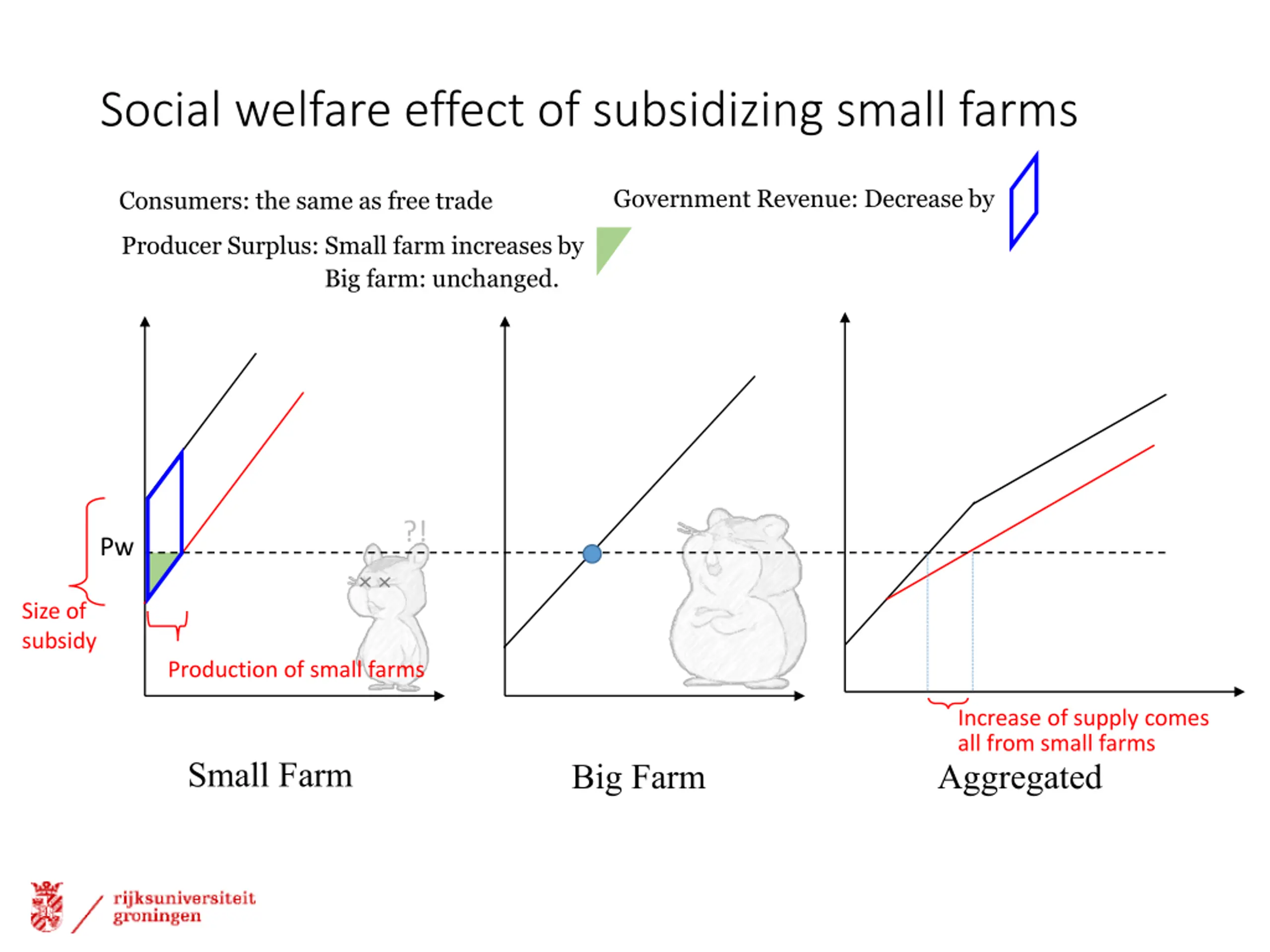 Social welfare effect of subsidizing small farms Government Revenue: Decrease by Consumers: the same as free trade Producer Surplus: Small farm increases by Big farm: unchanged. ?! Pw Size of subsidy Production of small farms Increase of supply comes all from small farms Small Farm Big Farm Aggregated
