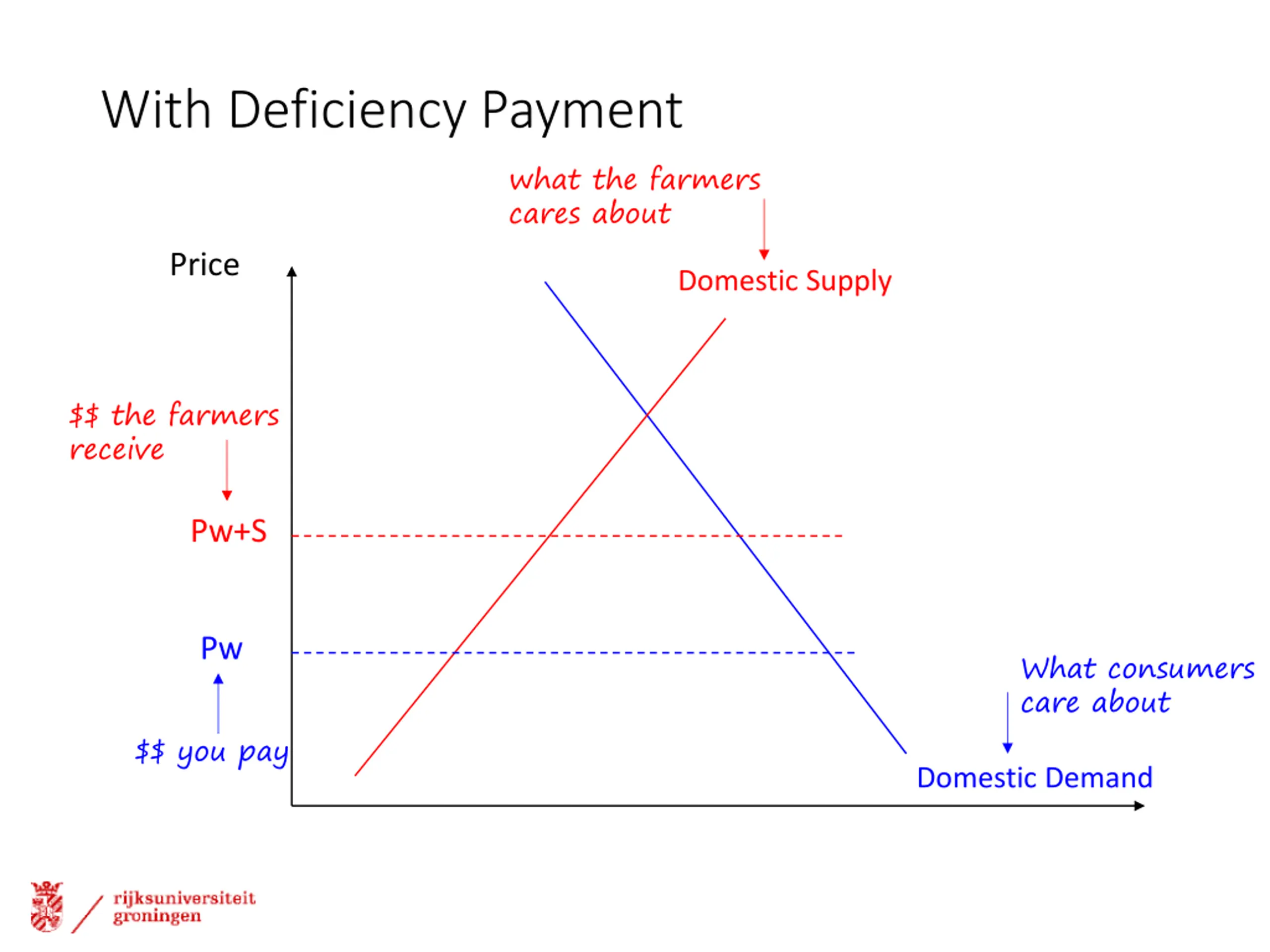 With Deficiency Payment what the farmers cares about Price Domestic Supply $$ the farmers receive Pw+S Pw What consumers care about $$ you pay Domestic Demand