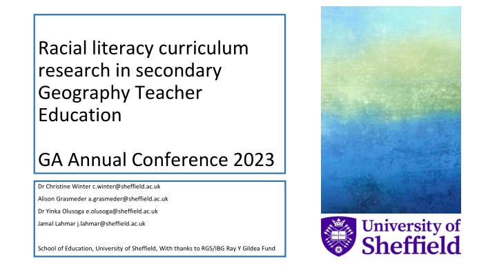 Racial literacy curriculum research in secondary Geography Teacher Education GA Annual Conference 2023 Dr Christine Winter c.winter@sheffield.ac.uk Alison Grasmeder a.grasmeder@sheffield.ac.uk Dr Yinka Olusoga e.olusoga@sheffield.ac.uk Jamal Lahmar j.lahmar@sheffield.ac.uk School of Education, University of Sheffield, With thanks to RGS/IBG Ray Y Gildea Fund