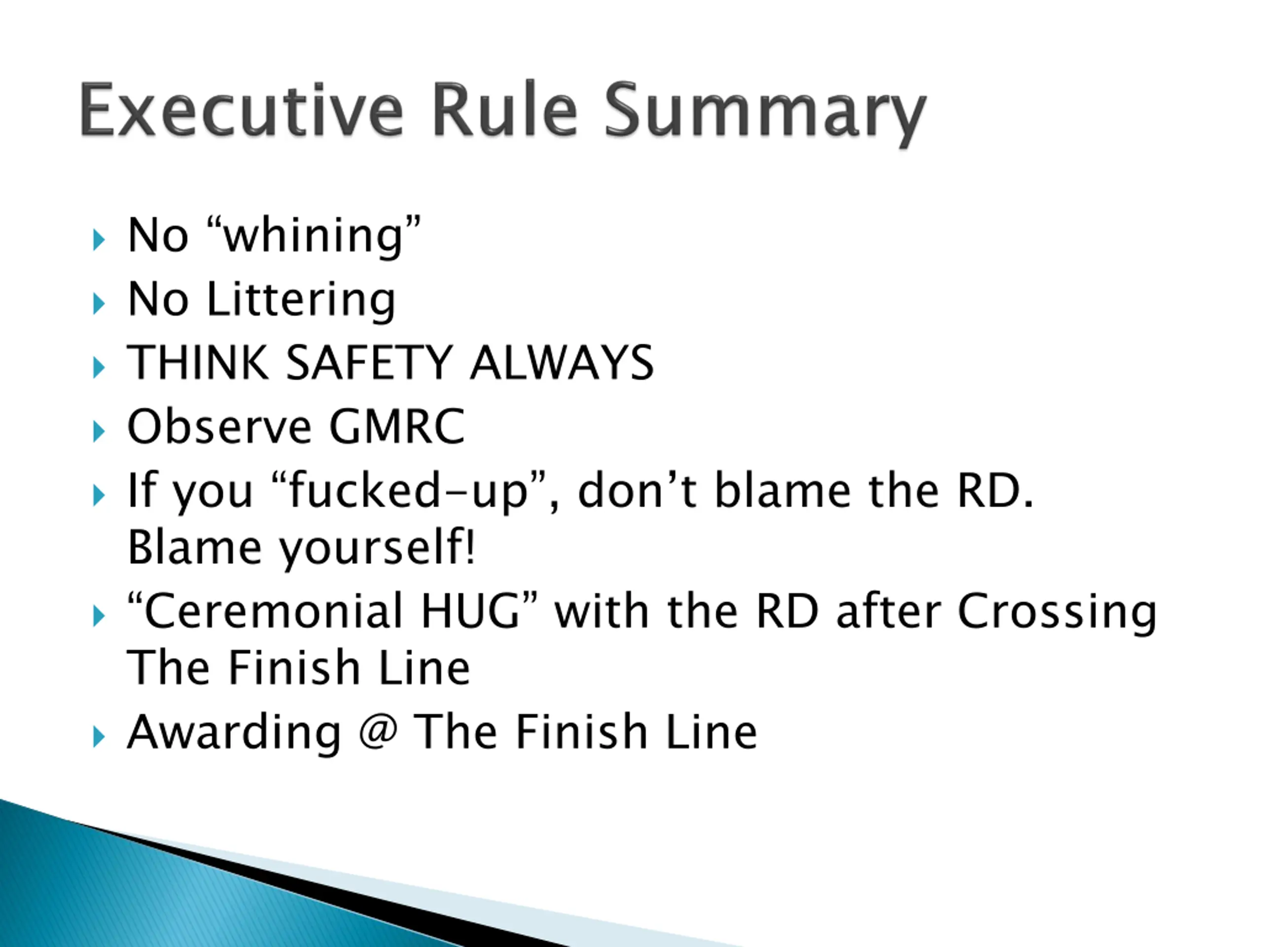 No whining No Littering THINK SAFETY ALWAYS Observe GMRC If you fucked-up , don t blame the RD. Blame yourself! Ceremonial HUG with the RD after Crossing The Finish Line Awarding @ The Finish Line
