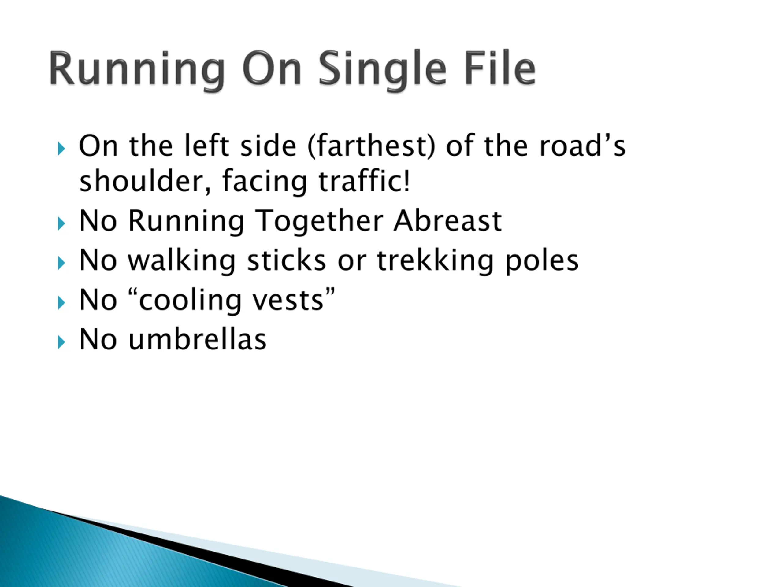On the left side (farthest) of the roads shoulder, facing traffic! No Running Together Abreast No walking sticks or trekking poles No cooling vests No umbrellas