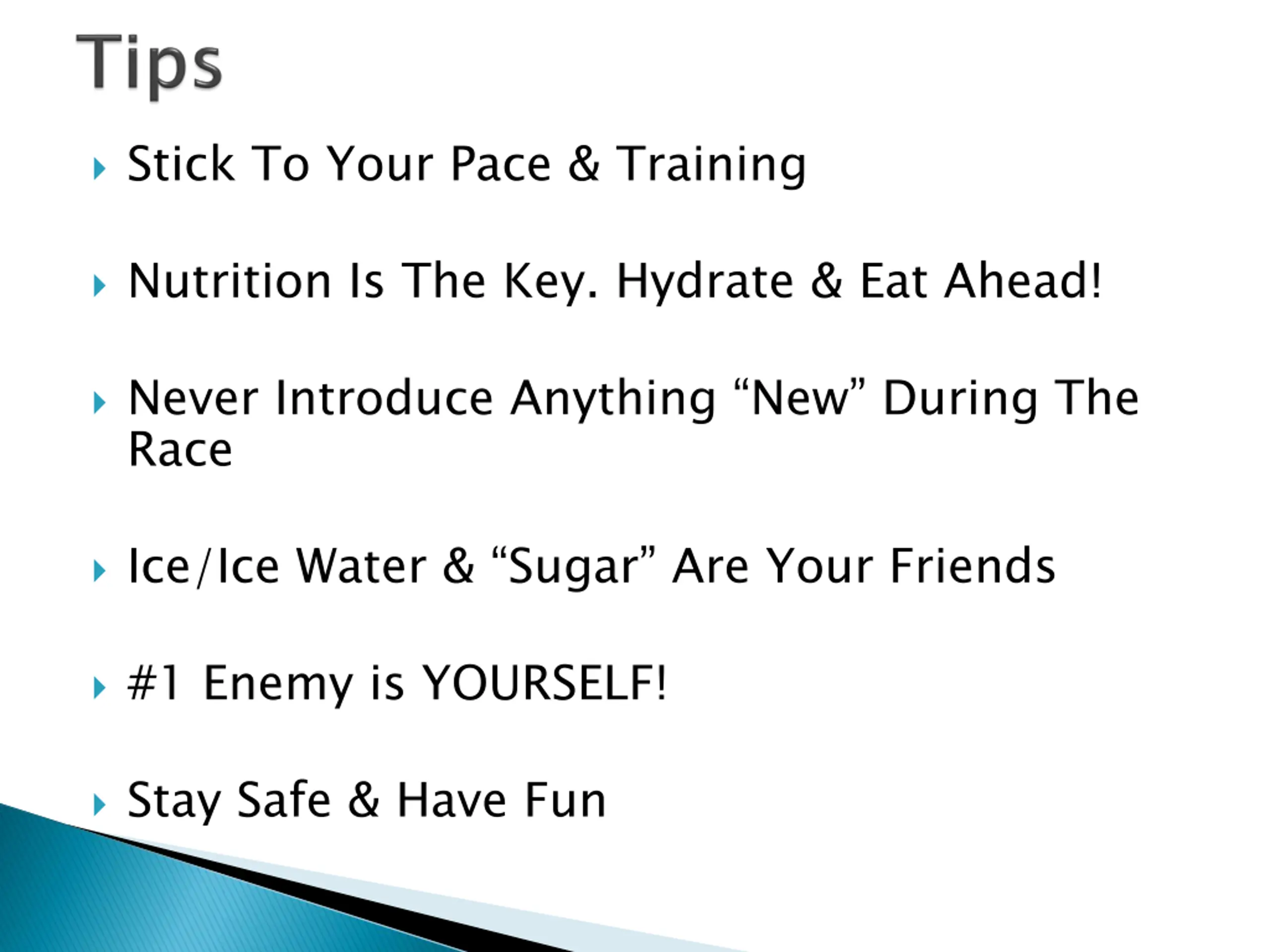 Stick To Your Pace & Training Nutrition Is The Key. Hydrate & Eat Ahead! Never Introduce Anything New During The Race Ice/Ice Water & Sugar Are Your Friends #1 Enemy is YOURSELF! Stay Safe & Have Fun