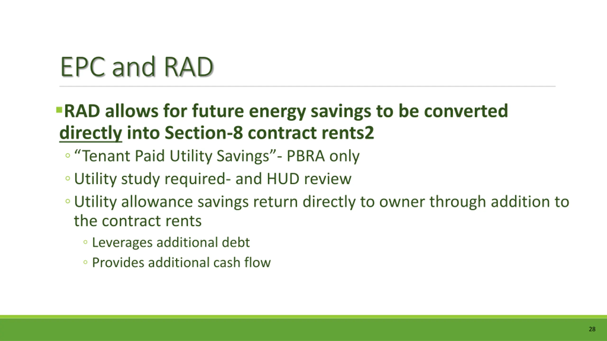 EPC and RAD EPCs add immense complexity to a RAD conversion RAD requires that properties address all existing debt, including EPCs, at or prior to conversion either by: Pay off the principal- if allowable under EPC Continue to pay debt service with consent of new lenders and EPC lender agrees to subordinate their lien to RAD use agreement and (likely) any new first mortgage PHAs considering entering into a new EPC that is considering RAD in the future must negotiate agreements that can be unwound with minimum complexity For example, PHAs should avoid financing that has lockouts or prepayments Discuss RAD with your EPC lender- will they agree to early pre-payment or subordination? Ensure it s reflected in documents 27