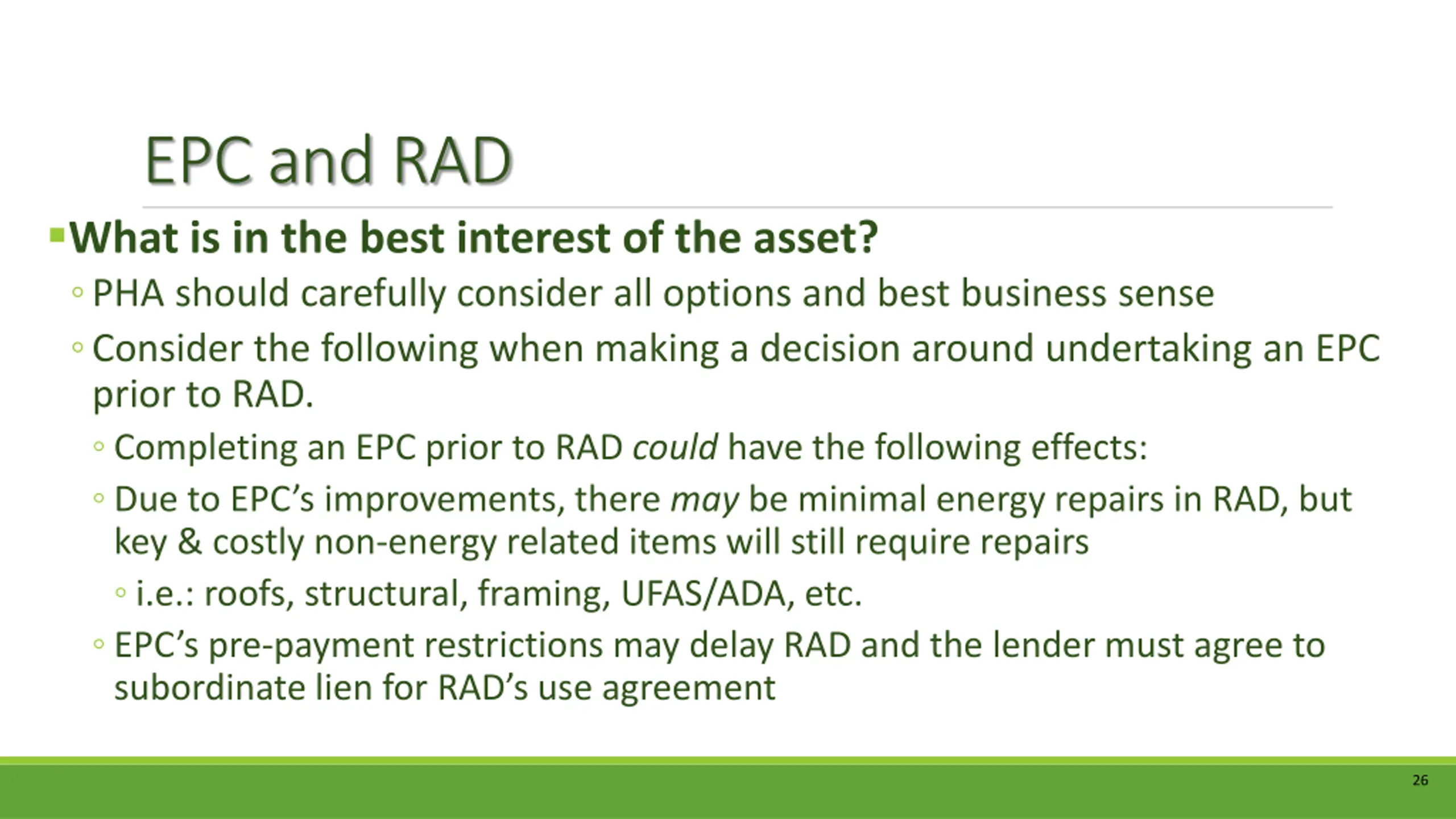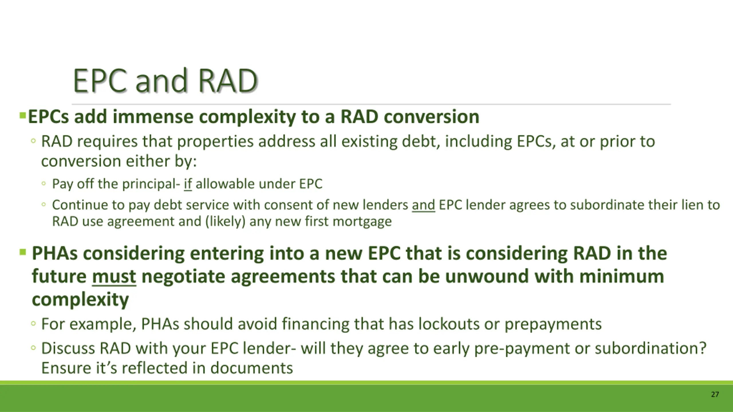 EPC and RAD What is in the best interest of the asset? PHA should carefully consider all options and best business sense Consider the following when making a decision around undertaking an EPC prior to RAD. Completing an EPC prior to RAD could have the following effects: Due to EPC s improvements, there may be minimal energy repairs in RAD, but key & costly non-energy related items will still require repairs i.e.: roofs, structural, framing, UFAS/ADA, etc. EPC s pre-payment restrictions may delay RAD and the lender must agree to subordinate lien for RAD s use agreement 26