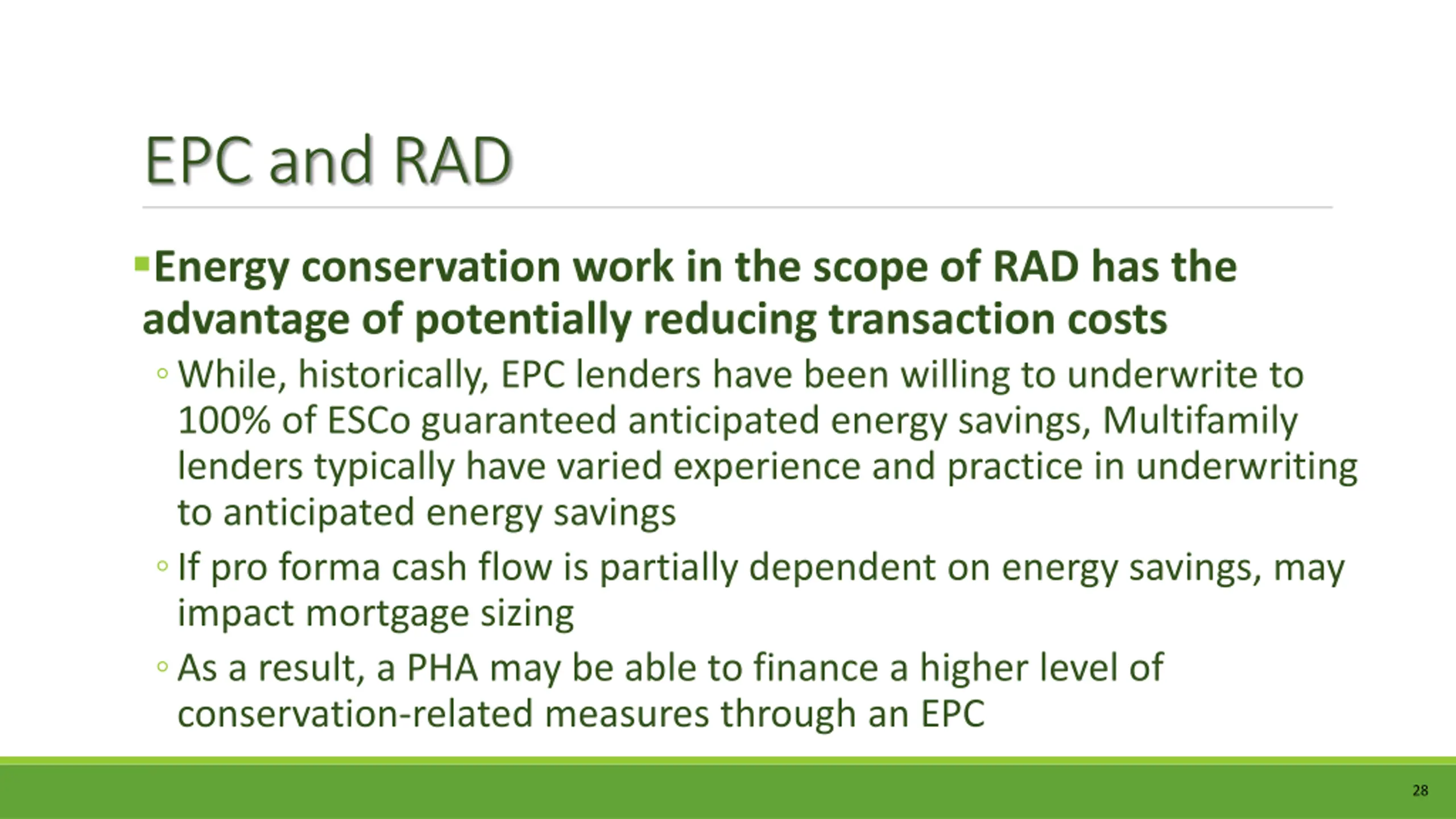 EPC and RAD Energy conservation work in the scope of RAD has the advantage of potentially reducing transaction costs While, historically, EPC lenders have been willing to underwrite to 100% of ESCo guaranteed anticipated energy savings, Multifamily lenders typically have varied experience and practice in underwriting to anticipated energy savings If pro forma cash flow is partially dependent on energy savings, may impact mortgage sizing As a result, a PHA may be able to finance a higher level of conservation-related measures through an EPC 28