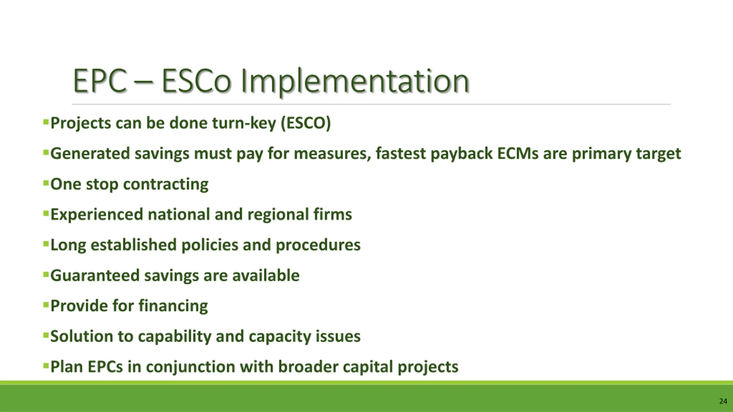 EPC ESCo Implementation Projects can be done turn-key (ESCO) Generated savings must pay for measures, fastest payback ECMs are primary target One stop contracting Experienced national and regional firms Long established policies and procedures Guaranteed savings are available Provide for financing Solution to capability and capacity issues Plan EPCs in conjunction with broader capital projects 24