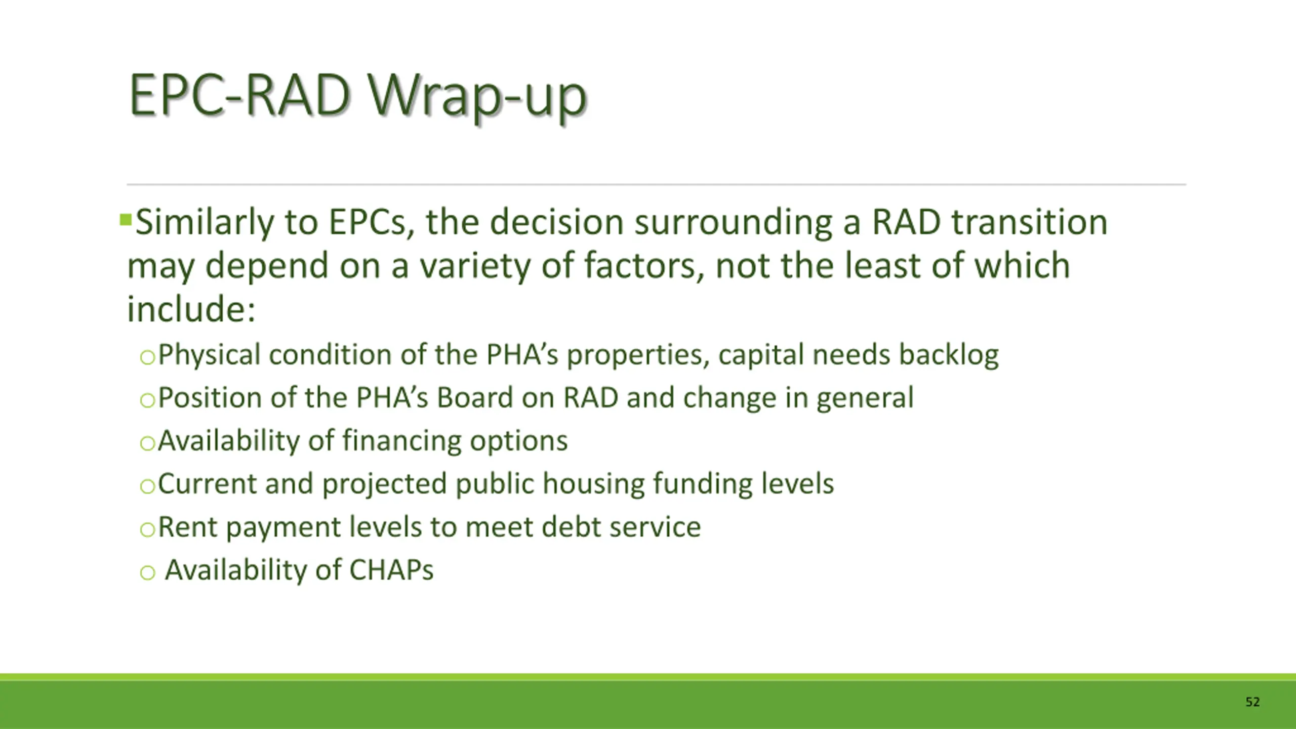EPC-RAD Wrap-up Similarly to EPCs, the decision surrounding a RAD transition may depend on a variety of factors, not the least of which include: oPhysical condition of the PHA s properties, capital needs backlog oPosition of the PHA s Board on RAD and change in general oAvailability of financing options oCurrent and projected public housing funding levels oRent payment levels to meet debt service o Availability of CHAPs 52