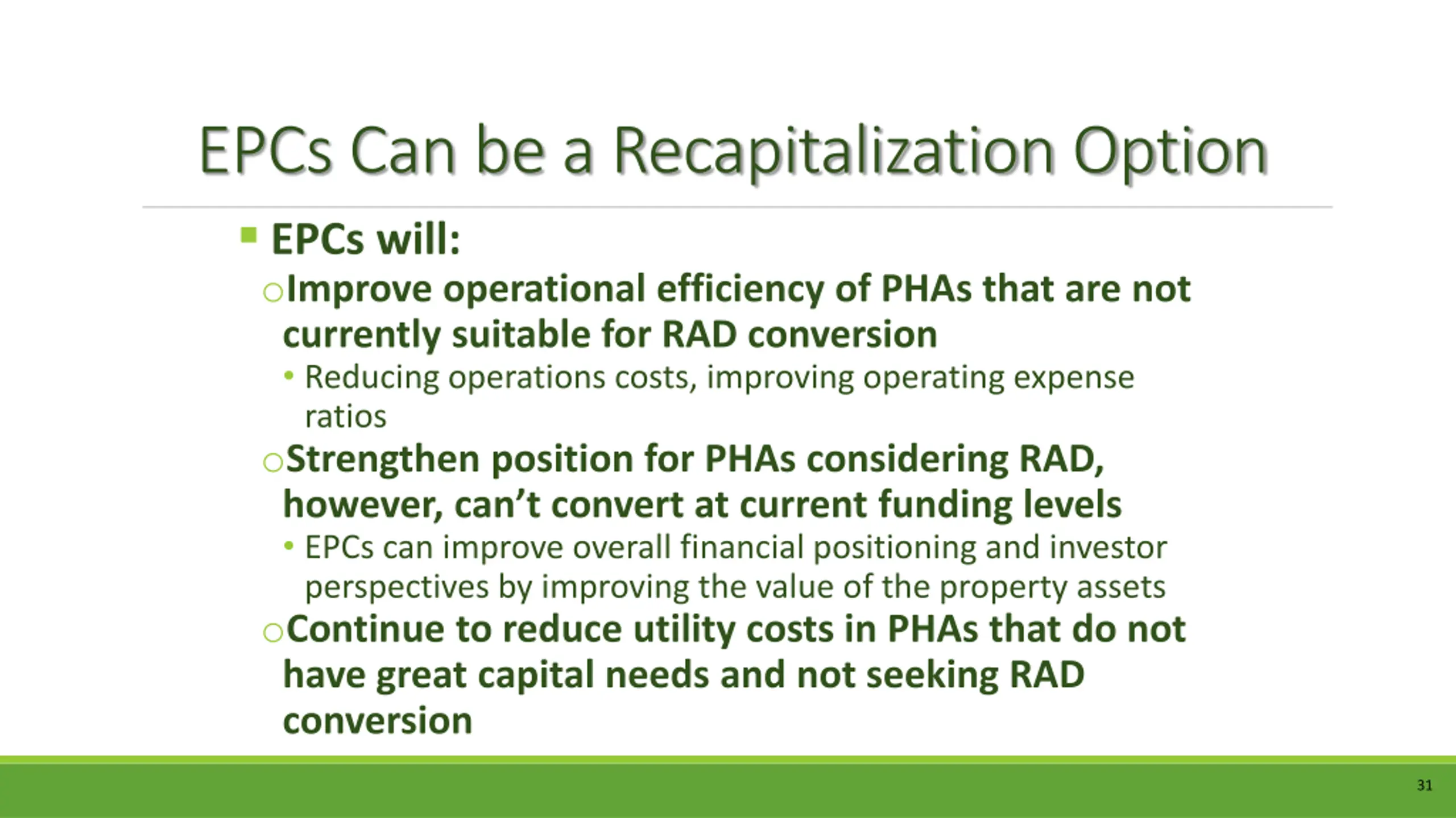 EPCs Can be a Recapitalization Option EPCs will: oImprove operational efficiency of PHAs that are not currently suitable for RAD conversion Reducing operations costs, improving operating expense ratios oStrengthen position for PHAs considering RAD, however, can t convert at current funding levels EPCs can improve overall financial positioning and investor perspectives by improving the value of the property assets oContinue to reduce utility costs in PHAs that do not have great capital needs and not seeking RAD conversion 31
