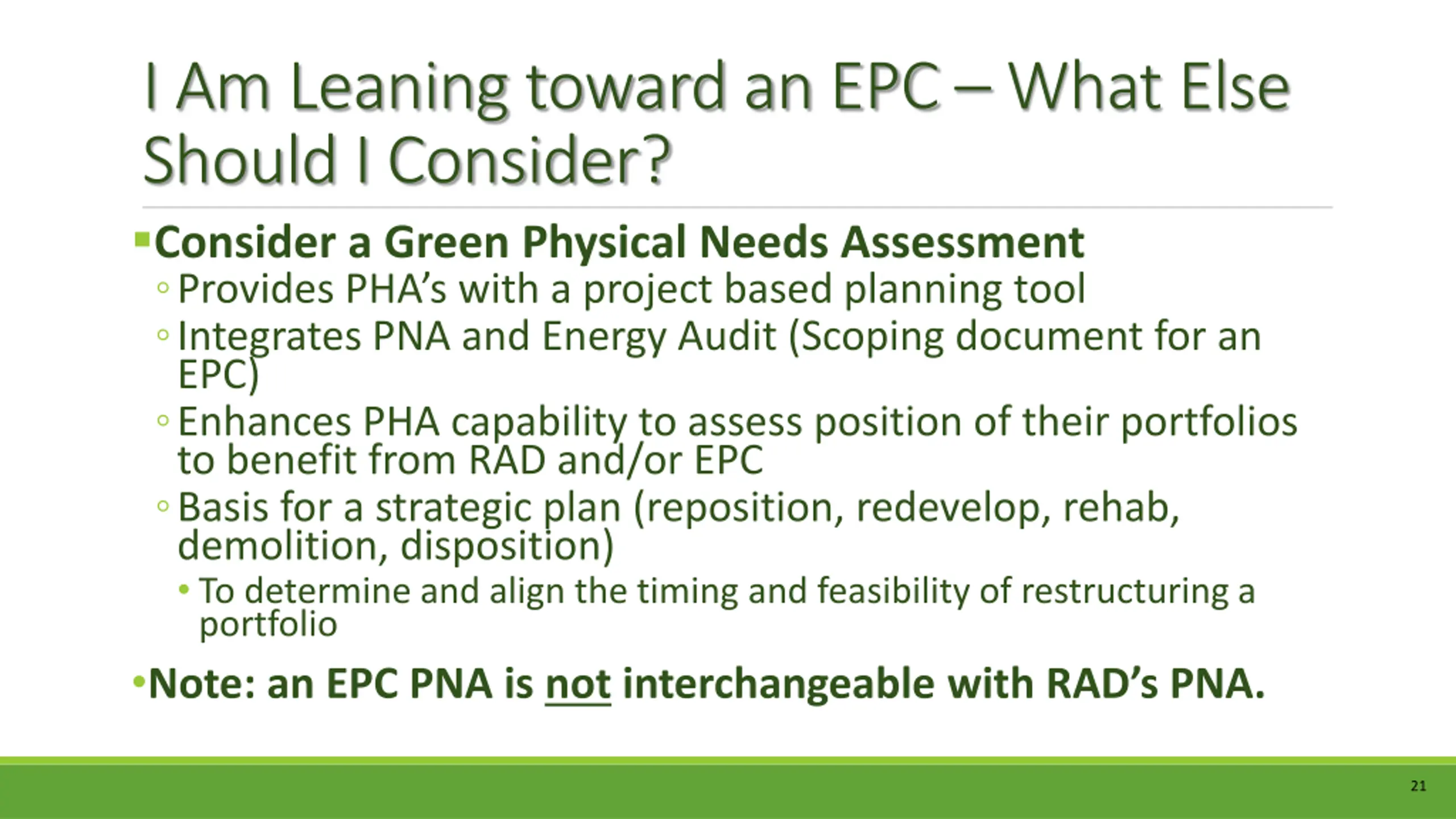 I Am Leaning toward an EPC What Else Should I Consider? Consider a Green Physical Needs Assessment Provides PHA s with a project based planning tool Integrates PNA and Energy Audit (Scoping document for an EPC) Enhances PHA capability to assess position of their portfolios to benefit from RAD and/or EPC Basis for a strategic plan (reposition, redevelop, rehab, demolition, disposition) To determine and align the timing and feasibility of restructuring a portfolio Note: an EPC PNA is not interchangeable with RAD s PNA. 21