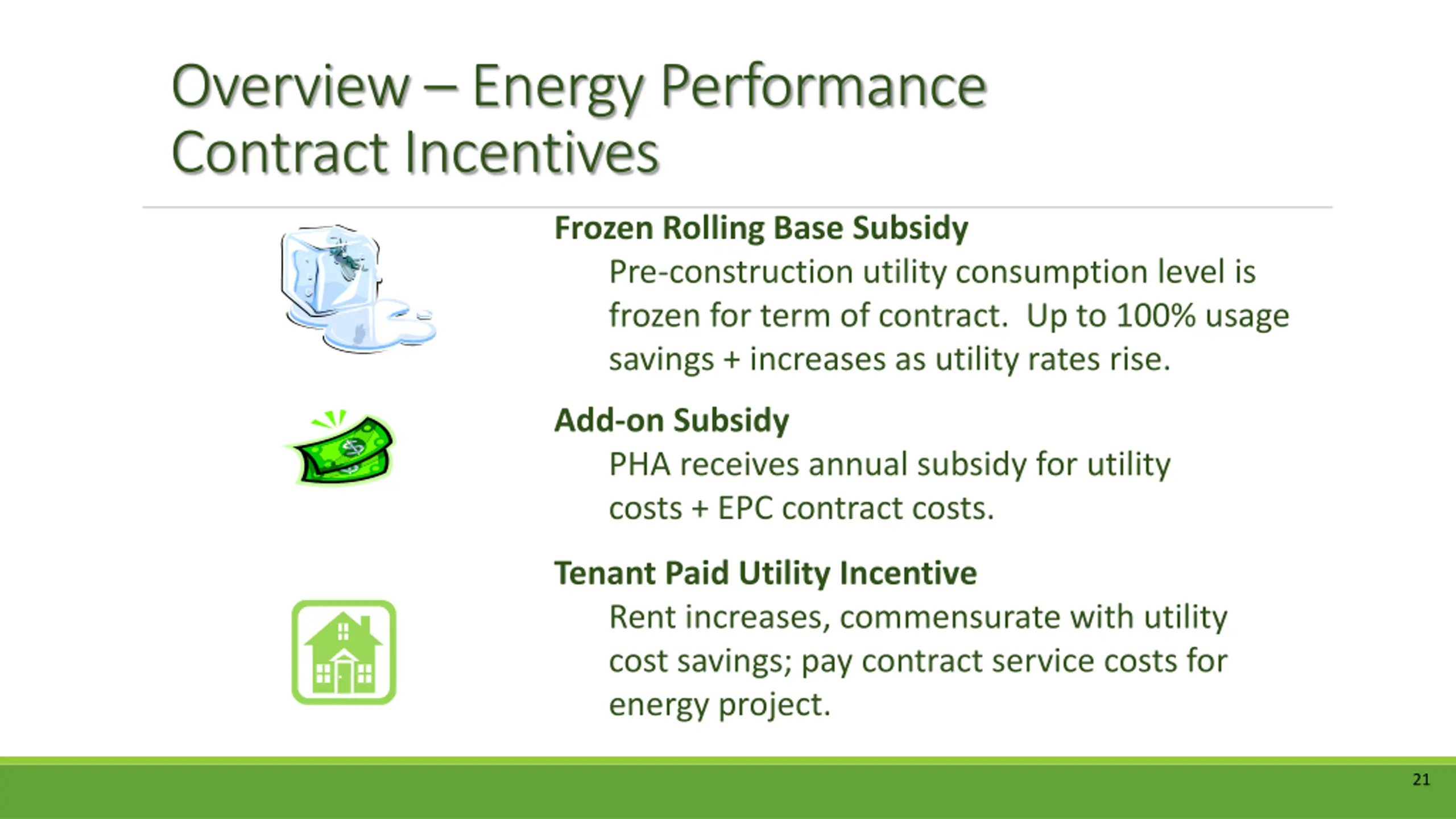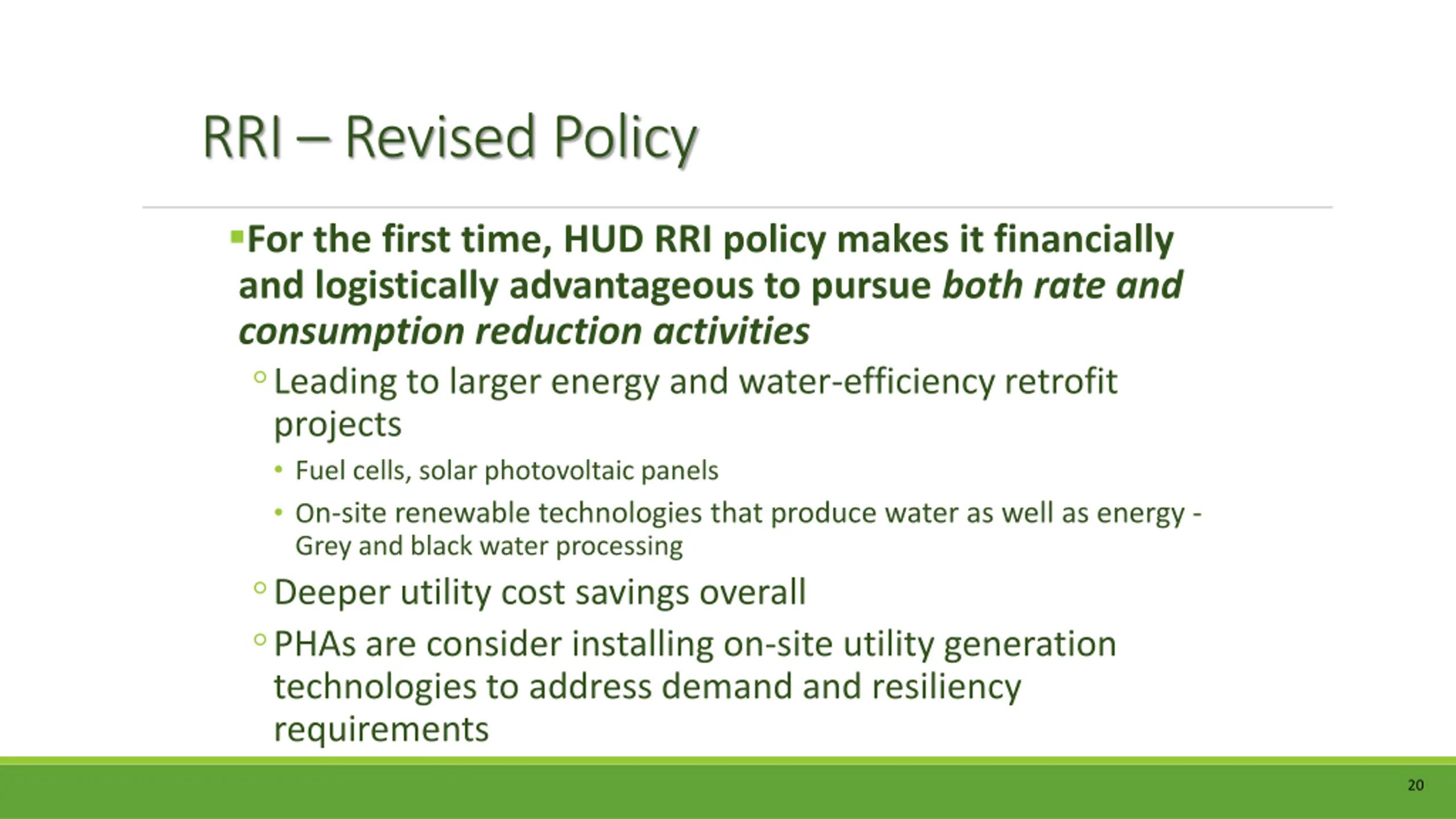 RRI Revised Policy For the first time, HUD RRI policy makes it financially and logistically advantageous to pursue both rate and consumption reduction activities Leading to larger energy and water-efficiency retrofit projects Fuel cells, solar photovoltaic panels On-site renewable technologies that produce water as well as energy - Grey and black water processing Deeper utility cost savings overall PHAs are consider installing on-site utility generation technologies to address demand and resiliency requirements 20