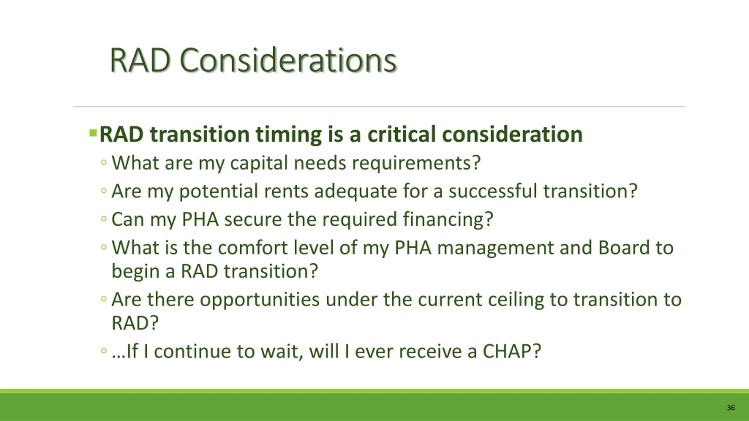 RAD Considerations RAD transition timing is a critical consideration What are my capital needs requirements? Are my potential rents adequate for a successful transition? Can my PHA secure the required financing? What is the comfort level of my PHA management and Board to begin a RAD transition? Are there opportunities under the current ceiling to transition to RAD? If I continue to wait, will I ever receive a CHAP? 36