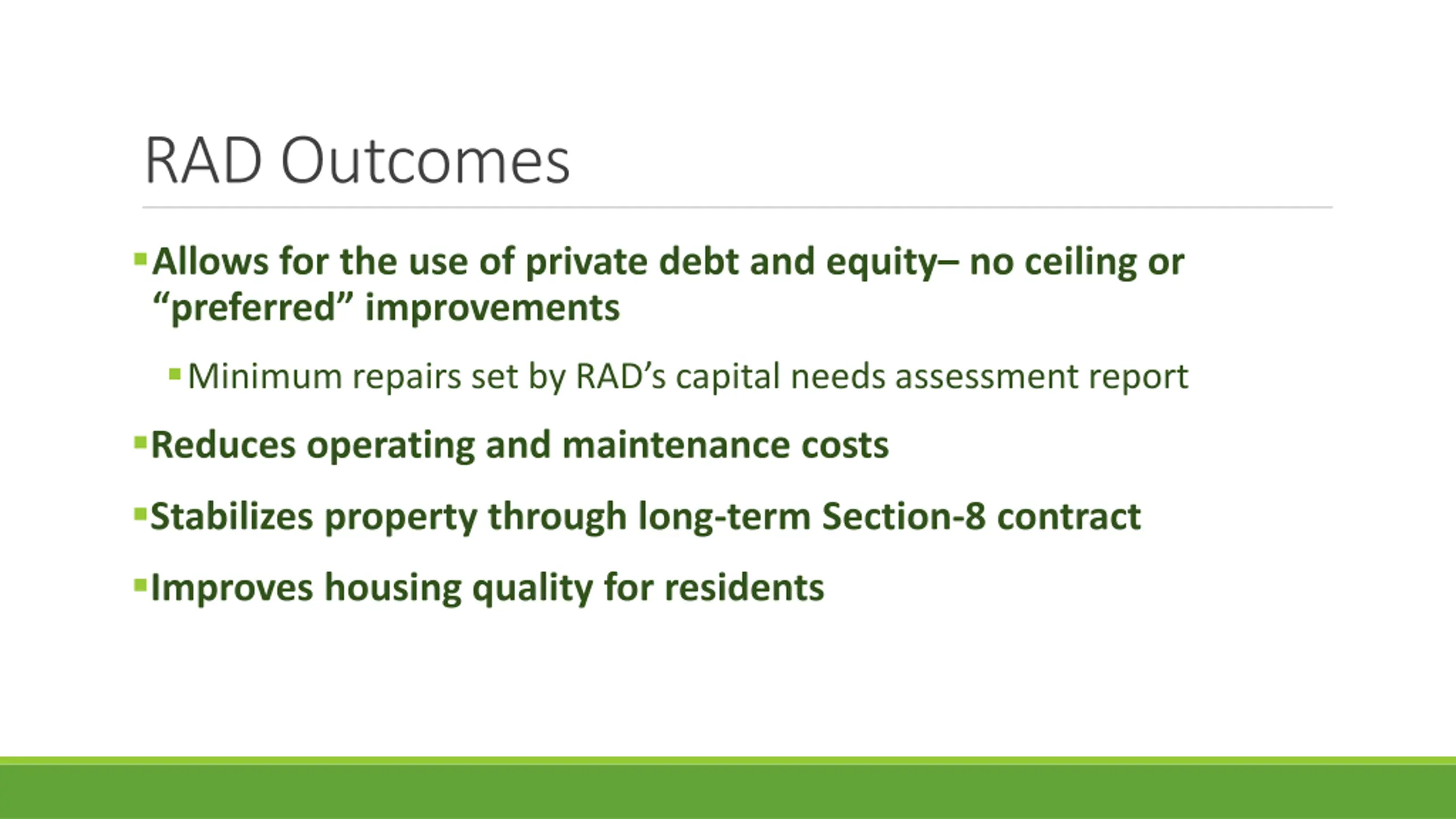 RAD Outcomes Allows for the use of private debt and equity no ceiling or preferred improvements Minimum repairs set by RAD s capital needs assessment report Reduces operating and maintenance costs Stabilizes property through long-term Section-8 contract Improves housing quality for residents
