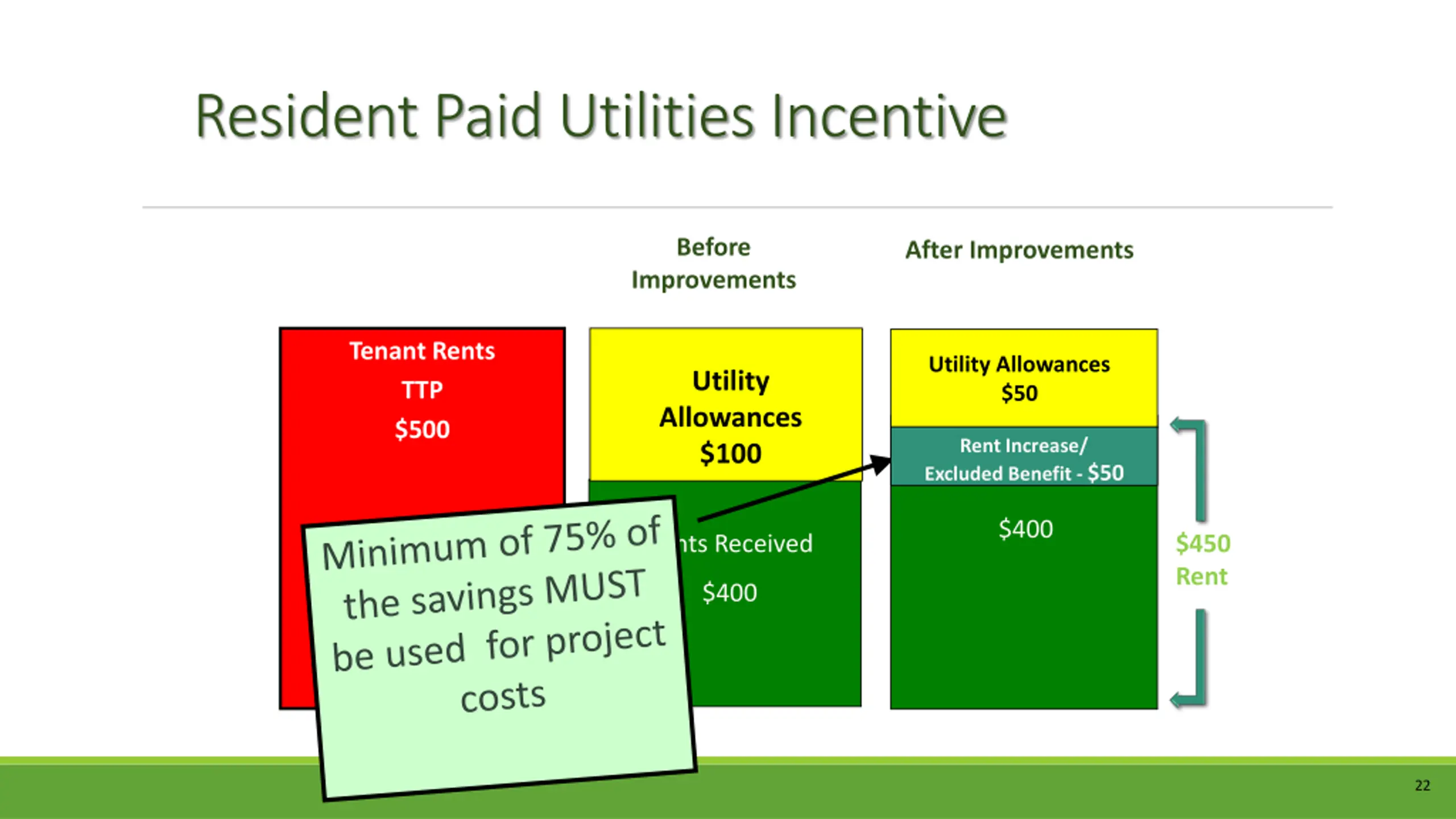 Overview Energy Performance Contract Incentives Frozen Rolling Base Subsidy Pre-construction utility consumption level is frozen for term of contract. Up to 100% usage savings + increases as utility rates rise. Add-on Subsidy PHA receives annual subsidy for utility costs + EPC contract costs. Tenant Paid Utility Incentive Rent increases, commensurate with utility cost savings; pay contract service costs for energy project. 21
