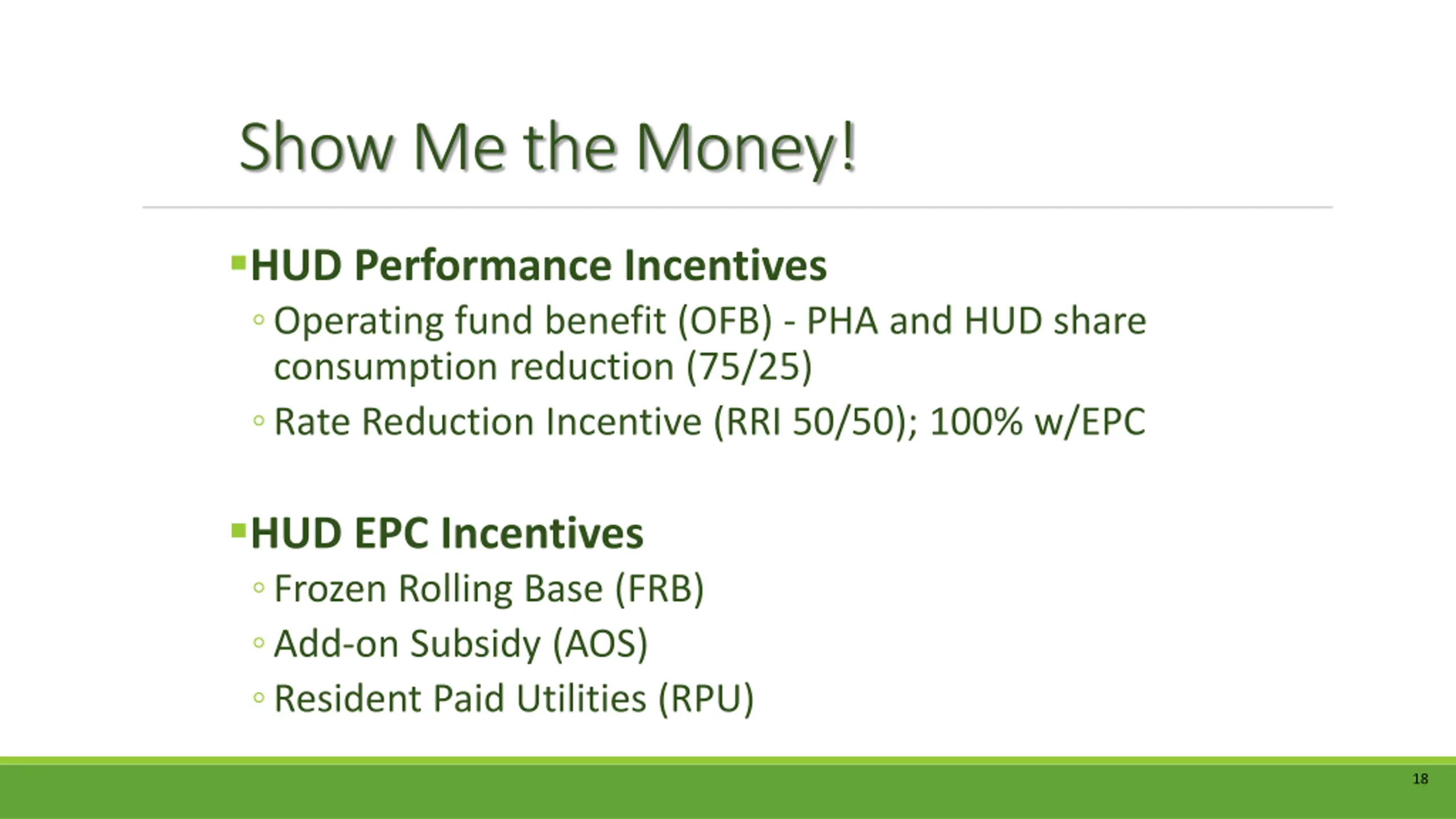 Show Me the Money! HUD Performance Incentives Operating fund benefit (OFB) - PHA and HUD share consumption reduction (75/25) Rate Reduction Incentive (RRI 50/50); 100% w/EPC HUD EPC Incentives Frozen Rolling Base (FRB) Add-on Subsidy (AOS) Resident Paid Utilities (RPU) 18