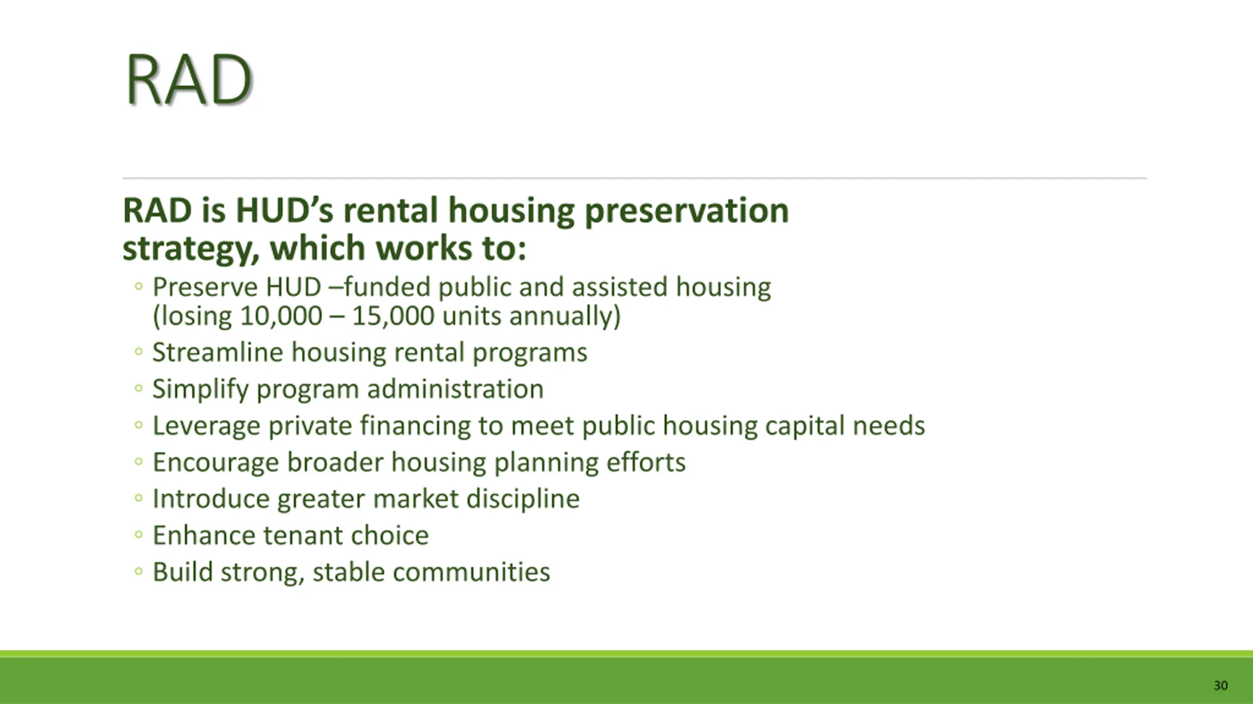RAD RAD is HUD s rental housing preservation strategy, which works to: Preserve HUD funded public and assisted housing (losing 10,000 15,000 units annually) Streamline housing rental programs Simplify program administration Leverage private financing to meet public housing capital needs Encourage broader housing planning efforts Introduce greater market discipline Enhance tenant choice Build strong, stable communities 30