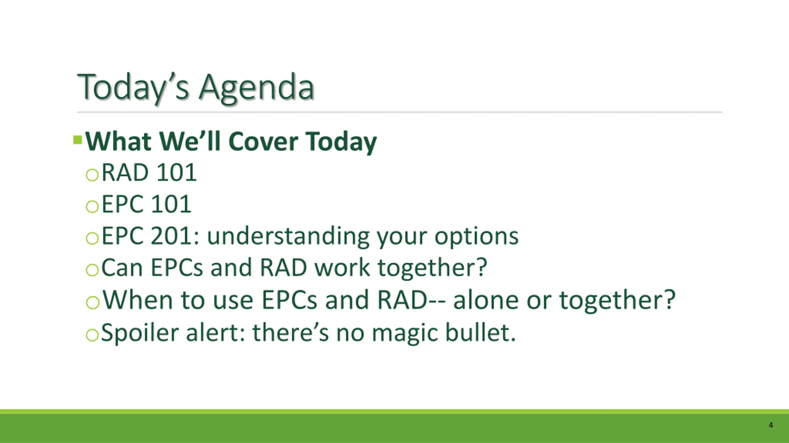 Todays Agenda What We ll Cover Today oRAD 101 oEPC 101 oEPC 201: understanding your options oCan EPCs and RAD work together? oWhen to use EPCs and RAD-- alone or together? oSpoiler alert: there s no magic bullet. 4
