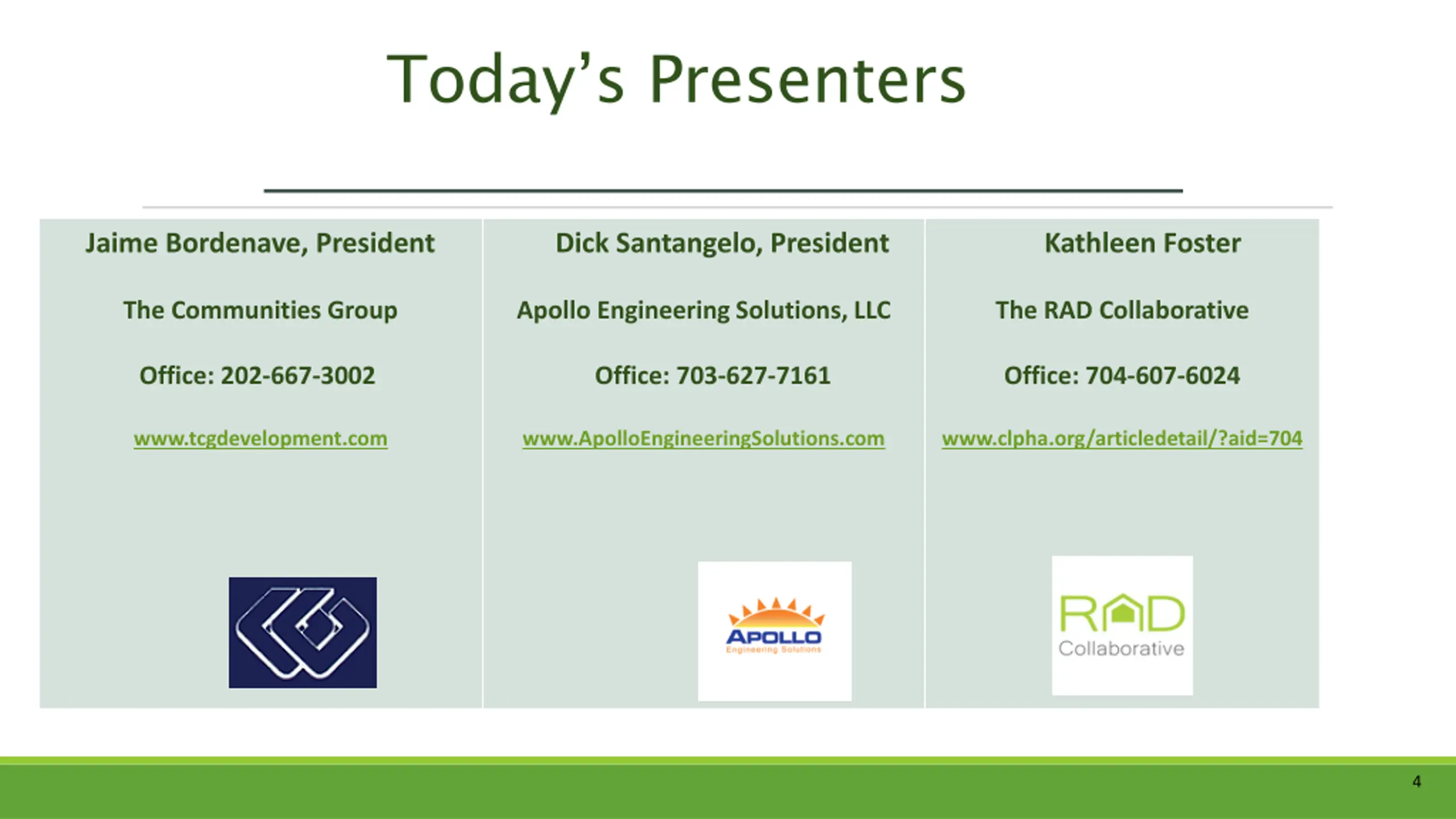 Todays Presenters Jaime Bordenave, President Dick Santangelo, President Kathleen Foster The Communities Group Apollo Engineering Solutions, LLC The RAD Collaborative Office: 202-667-3002 Office: 703-627-7161 Office: 704-607-6024 www.tcgdevelopment.com www.ApolloEngineeringSolutions.com www.clpha.org/articledetail/?aid=704 4