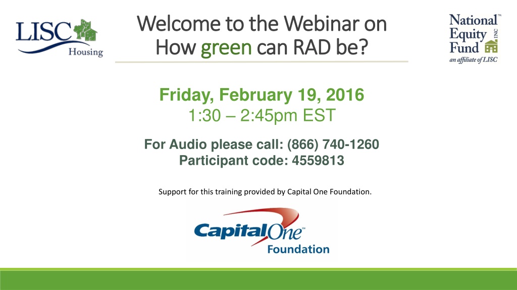 Welcome to the Webinar on Welcome to the Webinar on How How green greencan RAD be? can RAD be? Friday, February 19, 2016 1:30 2:45pm EST For Audio please call: (866) 740-1260 Participant code: 4559813 Support for this training provided by Capital One Foundation.