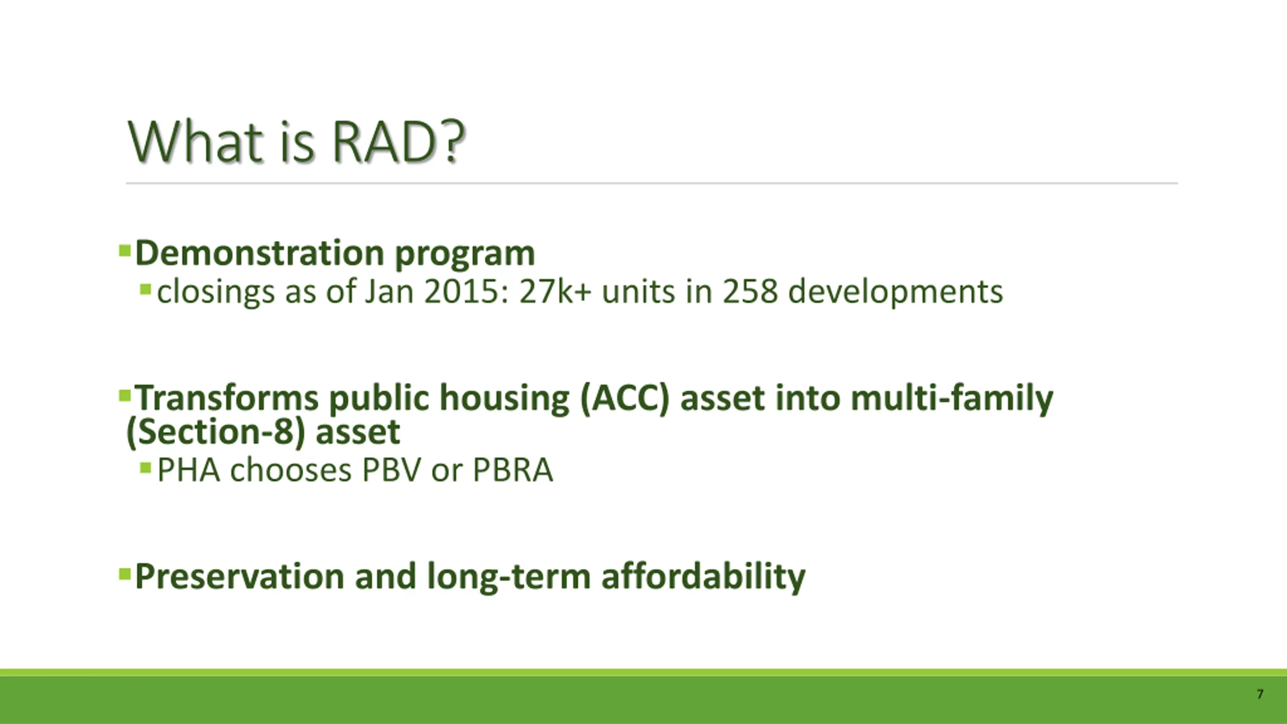 What is RAD? Demonstration program closings as of Jan 2015: 27k+ units in 258 developments Transforms public housing (ACC) asset into multi-family (Section-8) asset PHA chooses PBV or PBRA Preservation and long-term affordability 7