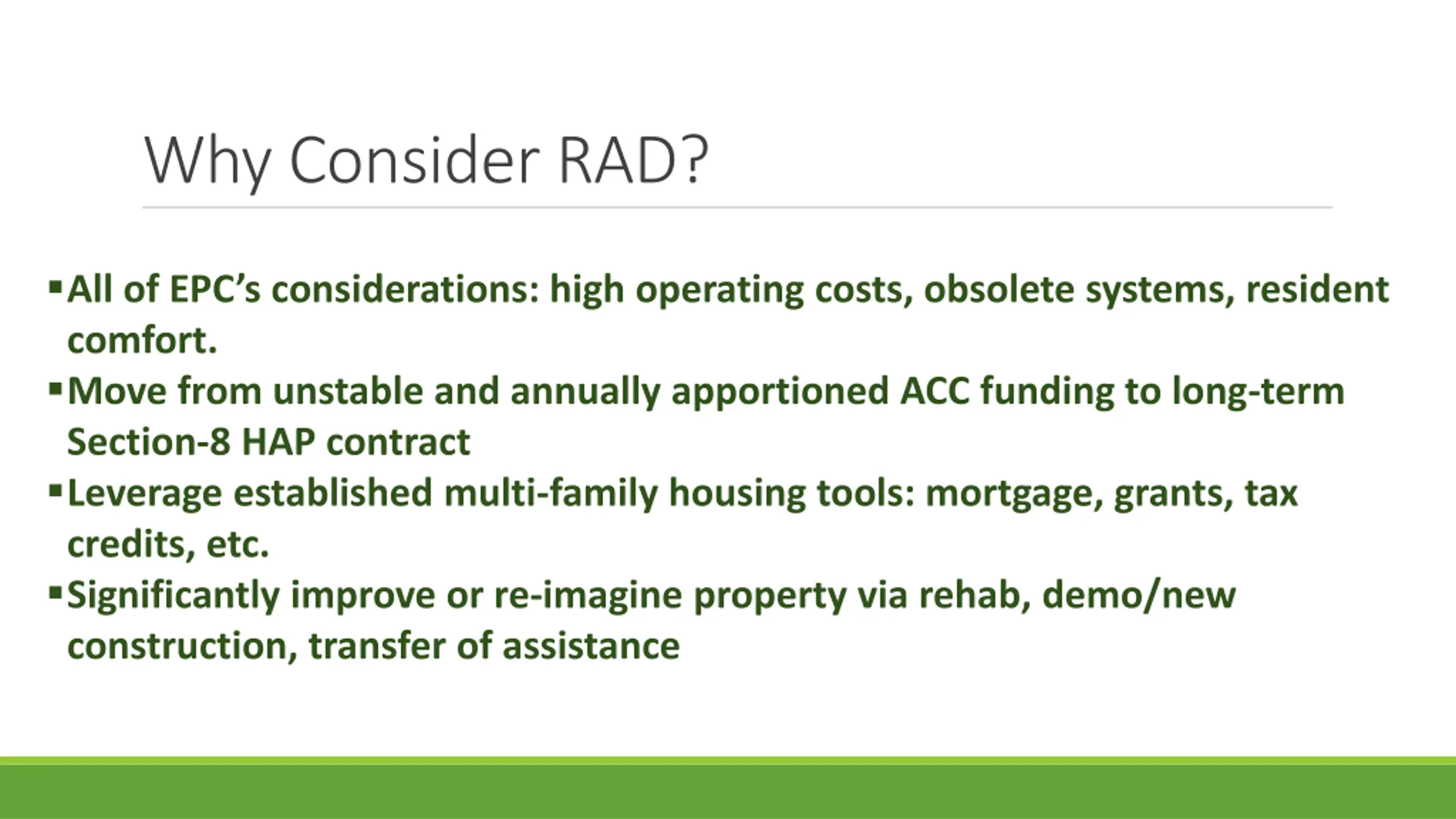 Why Consider RAD? All of EPC s considerations: high operating costs, obsolete systems, resident comfort. Move from unstable and annually apportioned ACC funding to long-term Section-8 HAP contract Leverage established multi-family housing tools: mortgage, grants, tax credits, etc. Significantly improve or re-imagine property via rehab, demo/new construction, transfer of assistance