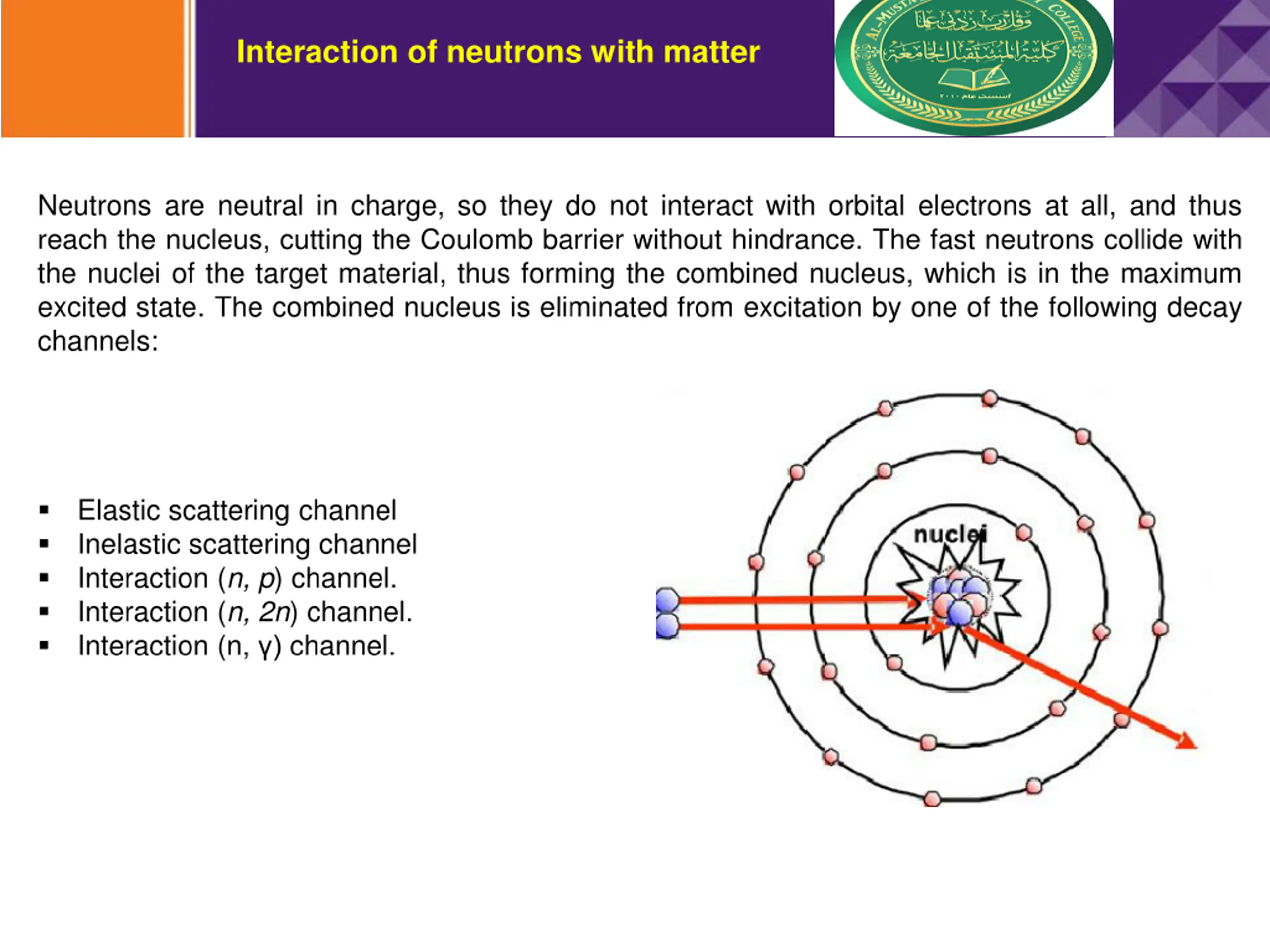 Interaction of neutrons with matter Neutrons are neutral in charge, so they do not interact with orbital electrons at all, and thus reach the nucleus, cutting the Coulomb barrier without hindrance. The fast neutrons collide with the nuclei of the target material, thus forming the combined nucleus, which is in the maximum excited state. The combined nucleus is eliminated from excitation by one of the following decay channels: Elastic scattering channel Inelastic scattering channel Interaction (n, p) channel. Interaction (n, 2n) channel. Interaction (n, ) channel.