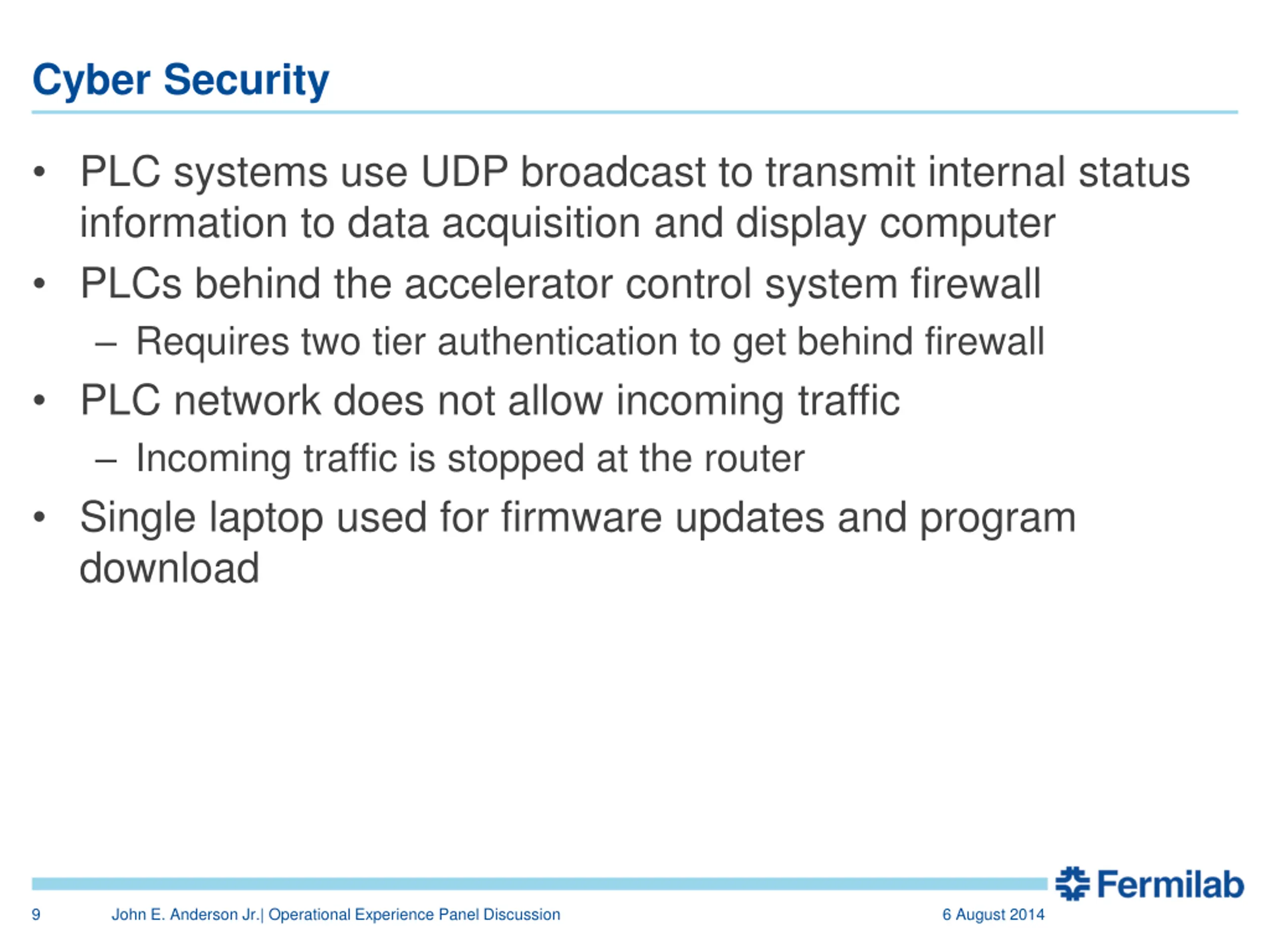 Cyber Security PLC systems use UDP broadcast to transmit internal status information to data acquisition and display computer PLCs behind the accelerator control system firewall Requires two tier authentication to get behind firewall PLC network does not allow incoming traffic Incoming traffic is stopped at the router Single laptop used for firmware updates and program download 9 John E. Anderson Jr.| Operational Experience Panel Discussion 6 August 2014