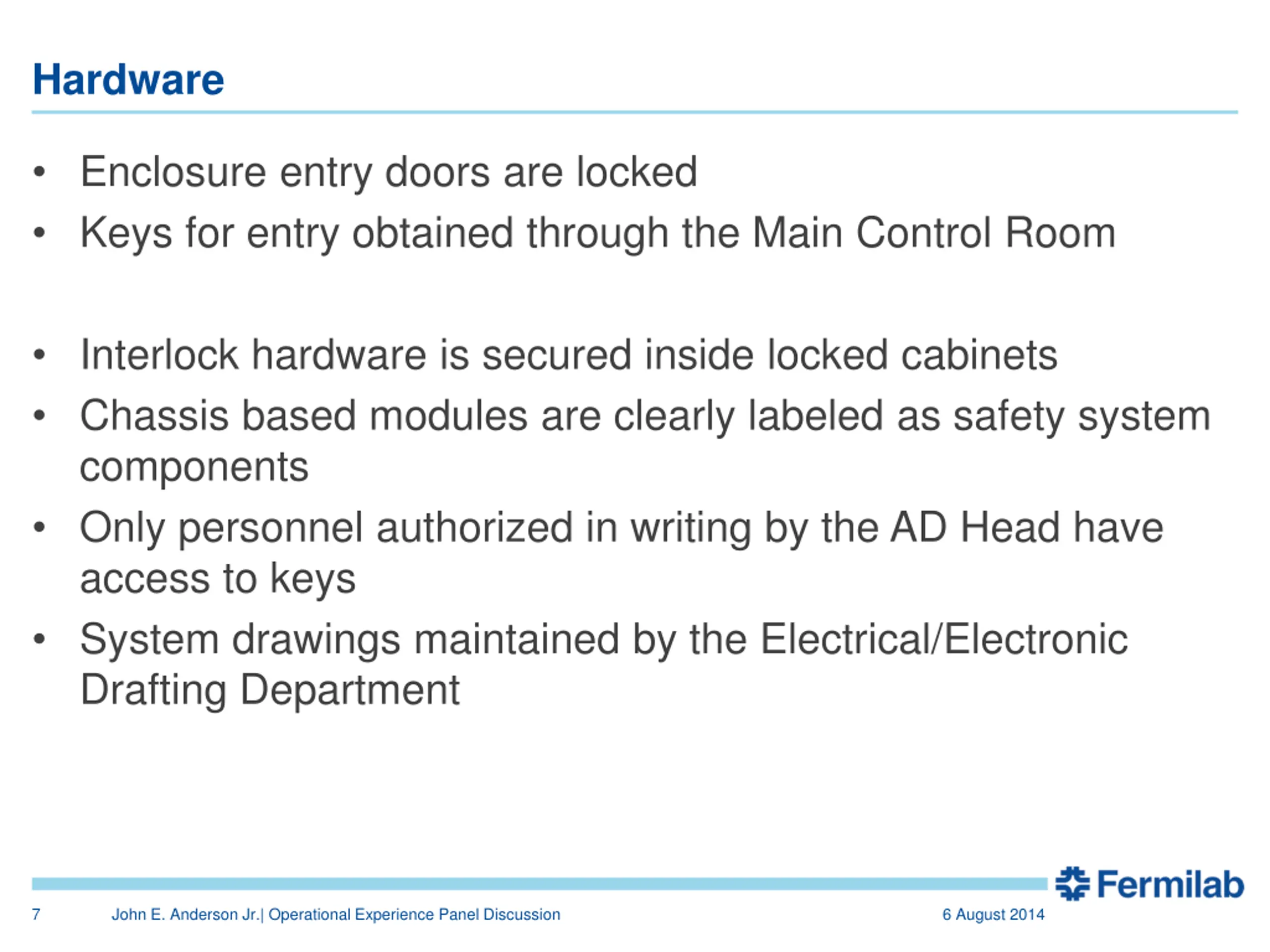 Hardware Enclosure entry doors are locked Keys for entry obtained through the Main Control Room Interlock hardware is secured inside locked cabinets Chassis based modules are clearly labeled as safety system components Only personnel authorized in writing by the AD Head have access to keys System drawings maintained by the Electrical/Electronic Drafting Department 7 John E. Anderson Jr.| Operational Experience Panel Discussion 6 August 2014