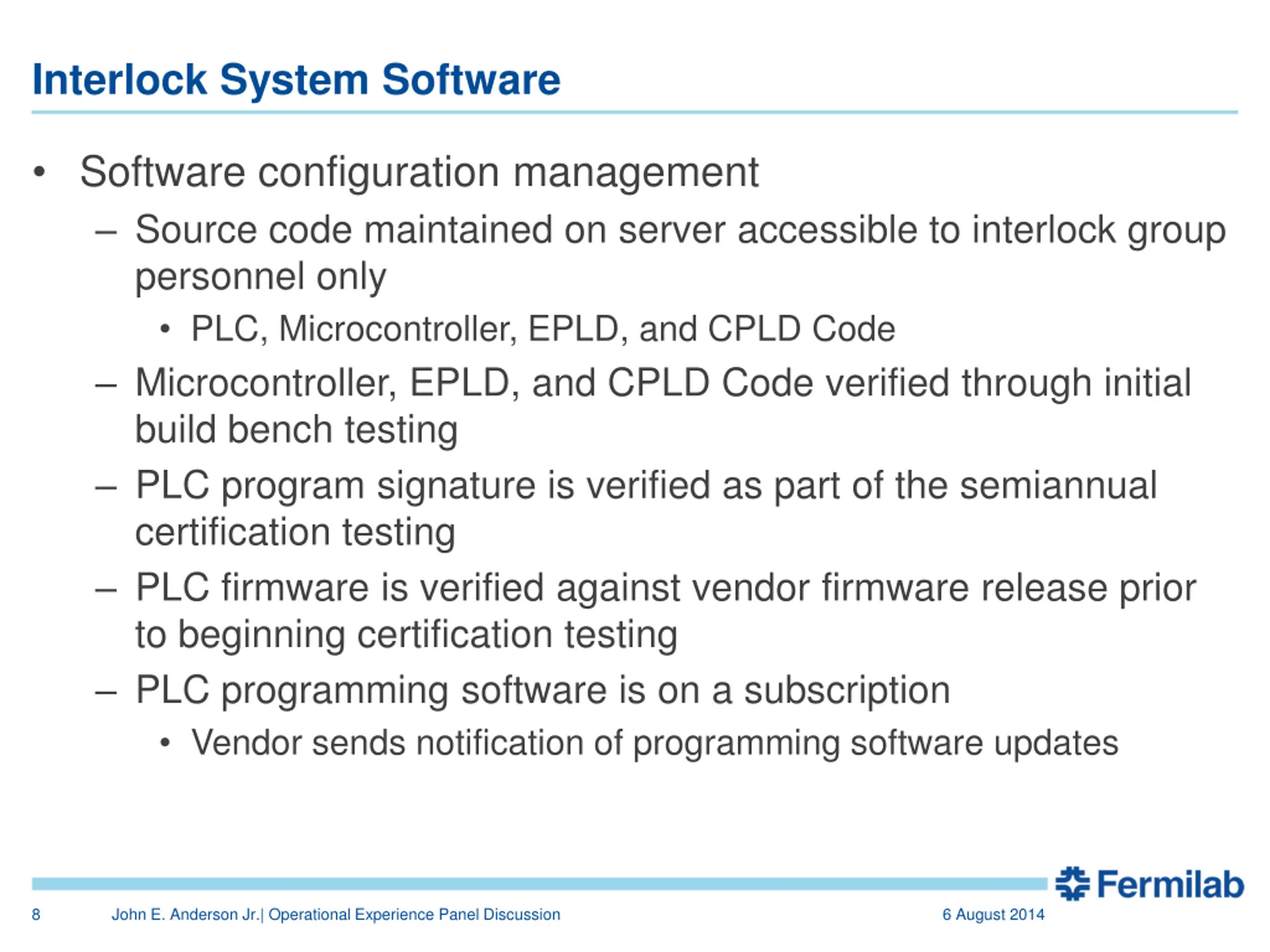 Interlock System Software Software configuration management Source code maintained on server accessible to interlock group personnel only PLC, Microcontroller, EPLD, and CPLD Code Microcontroller, EPLD, and CPLD Code verified through initial build bench testing PLC program signature is verified as part of the semiannual certification testing PLC firmware is verified against vendor firmware release prior to beginning certification testing PLC programming software is on a subscription Vendor sends notification of programming software updates 8 John E. Anderson Jr.| Operational Experience Panel Discussion 6 August 2014