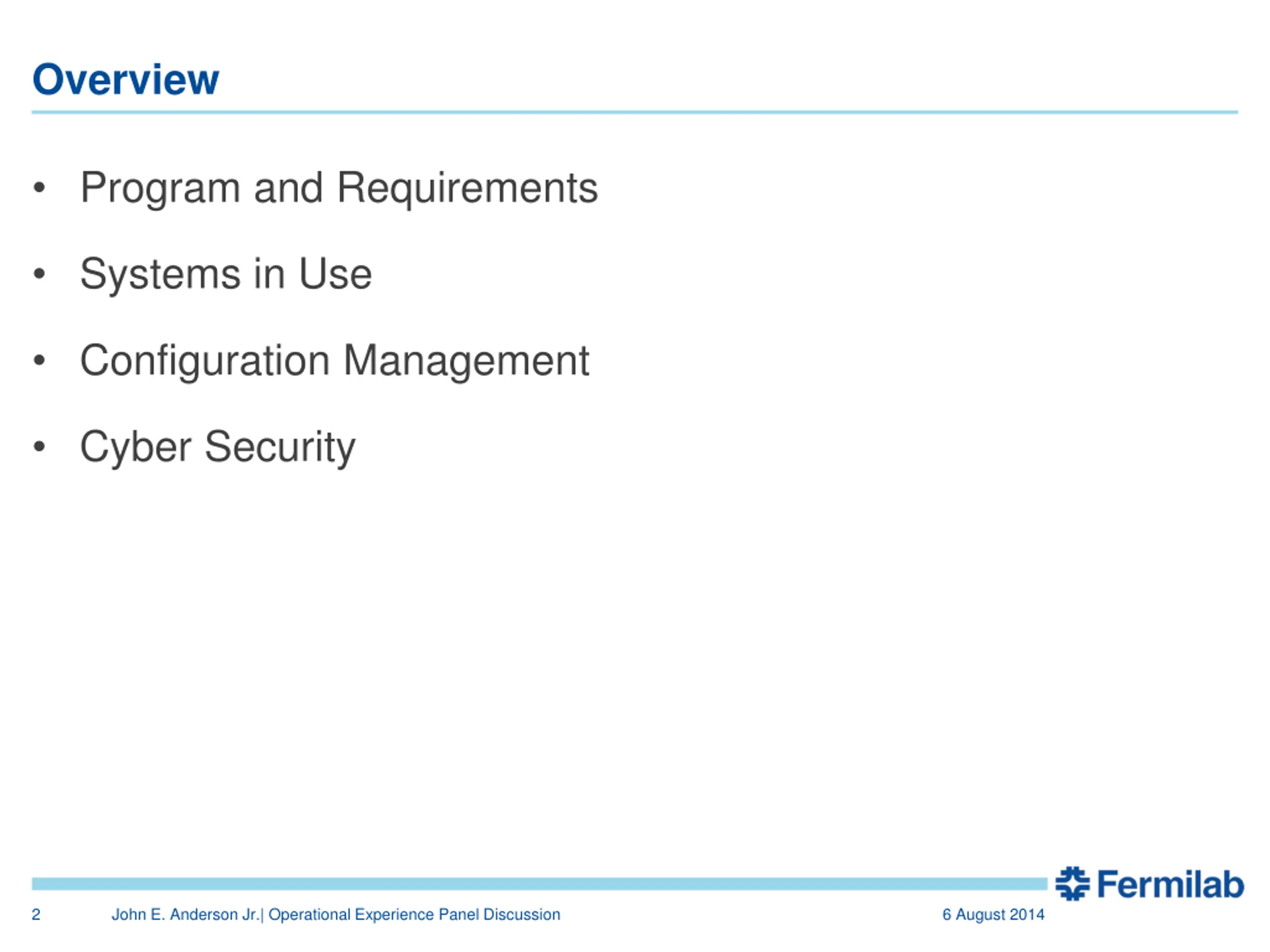 Overview Program and Requirements Systems in Use Configuration Management Cyber Security 2 John E. Anderson Jr.| Operational Experience Panel Discussion 6 August 2014