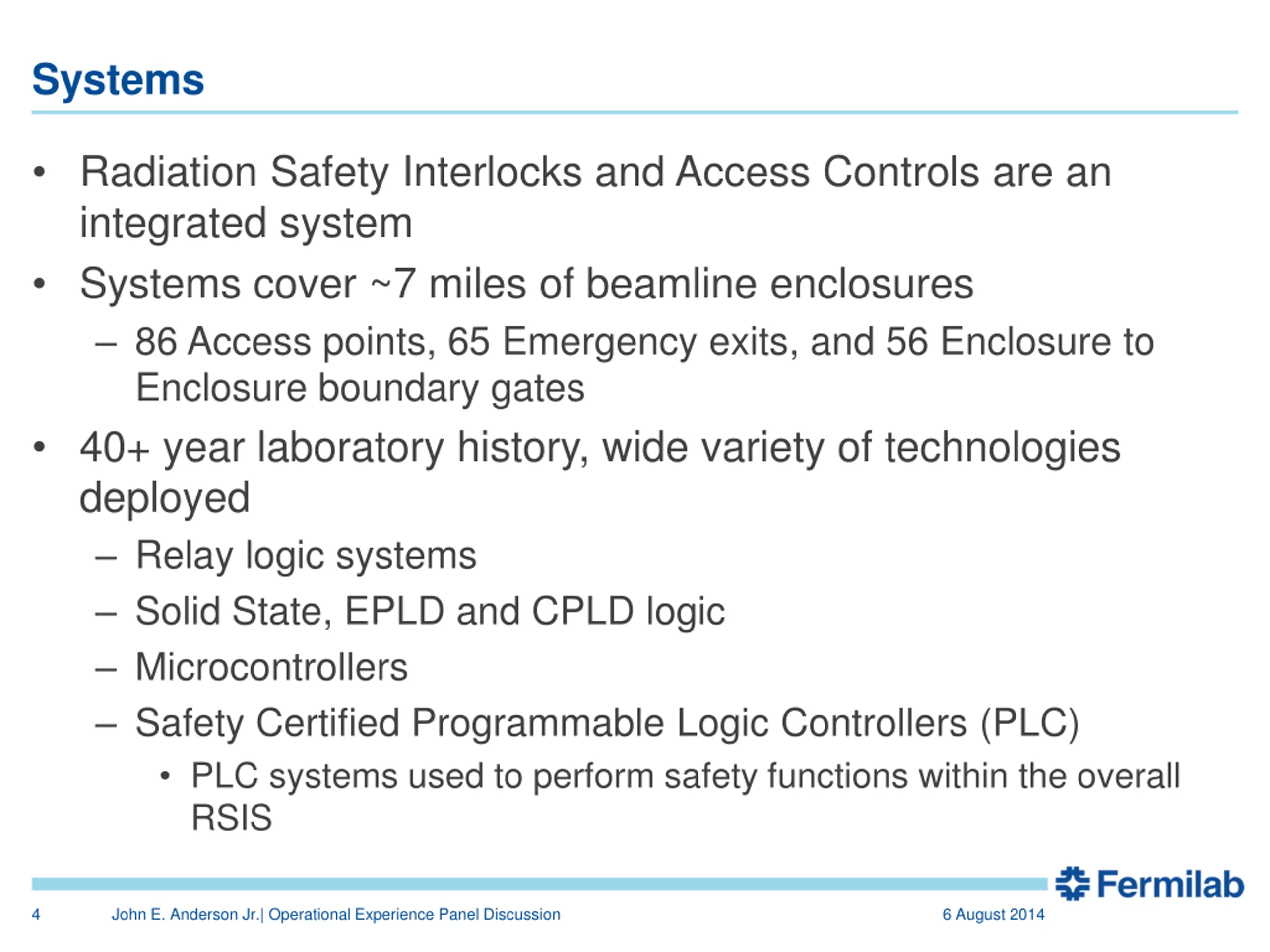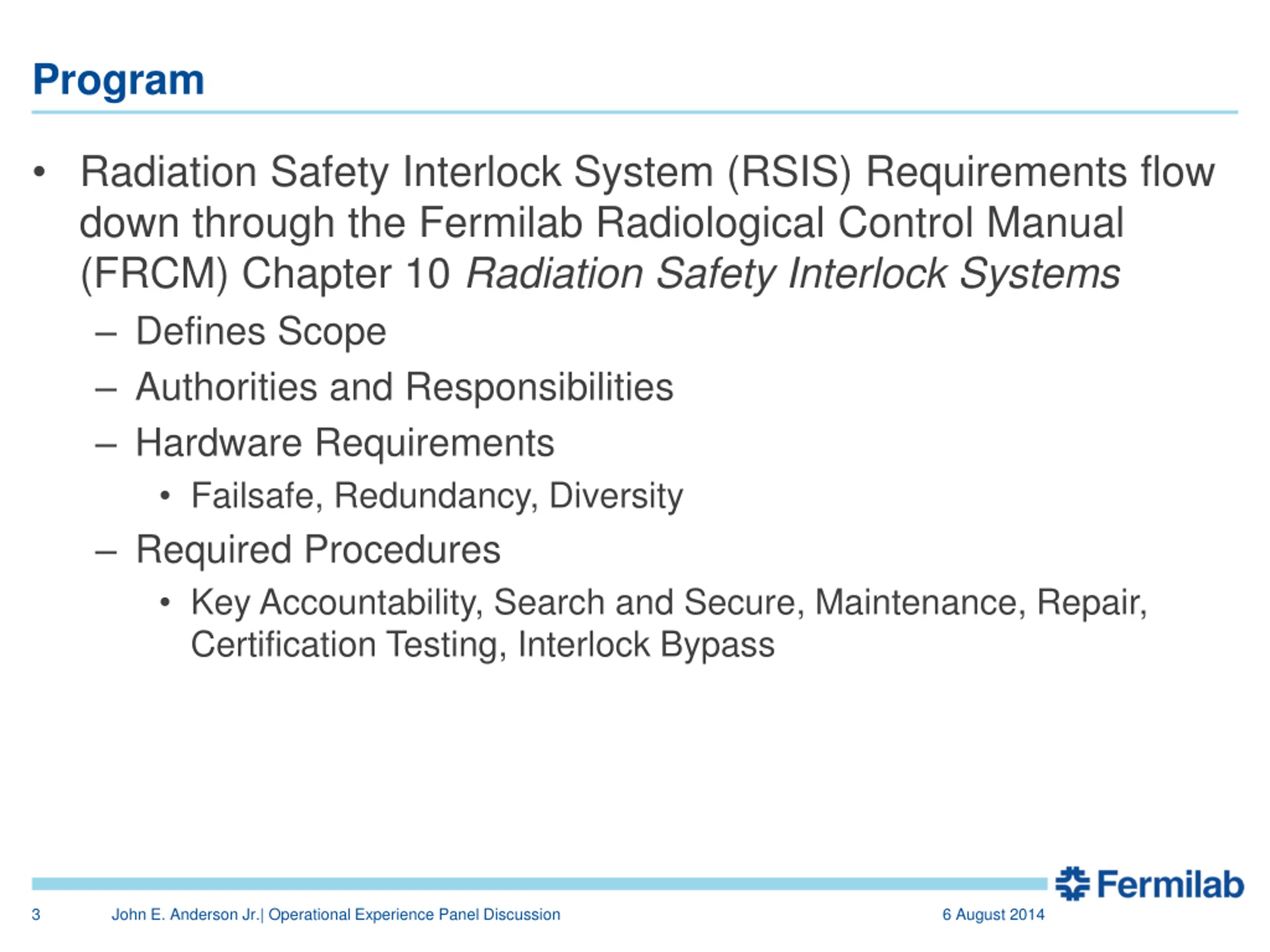 Program Radiation Safety Interlock System (RSIS) Requirements flow down through the Fermilab Radiological Control Manual (FRCM) Chapter 10 Radiation Safety Interlock Systems Defines Scope Authorities and Responsibilities Hardware Requirements Failsafe, Redundancy, Diversity Required Procedures Key Accountability, Search and Secure, Maintenance, Repair, Certification Testing, Interlock Bypass 3 John E. Anderson Jr.| Operational Experience Panel Discussion 6 August 2014