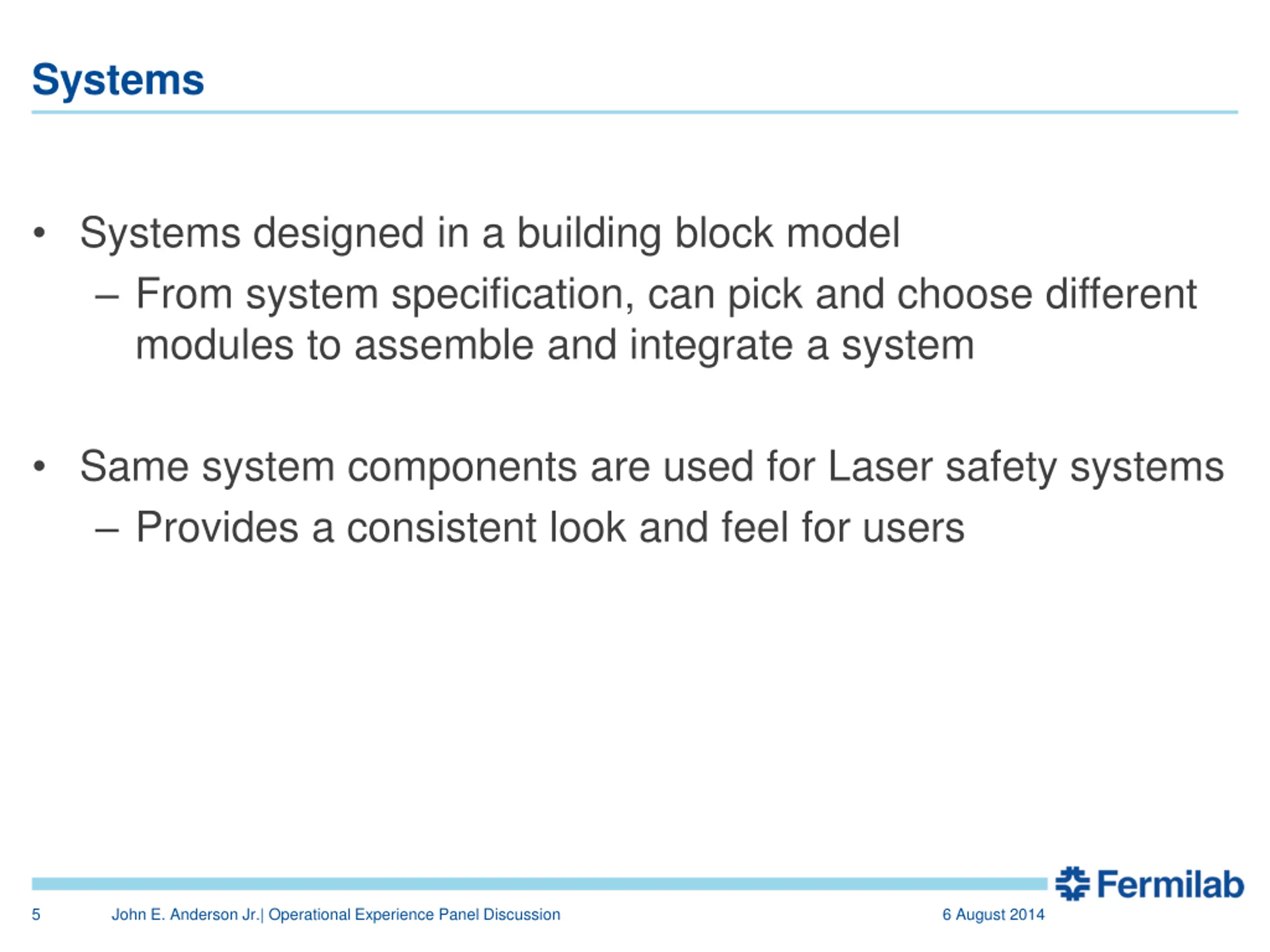 Systems Systems designed in a building block model From system specification, can pick and choose different modules to assemble and integrate a system Same system components are used for Laser safety systems Provides a consistent look and feel for users 5 John E. Anderson Jr.| Operational Experience Panel Discussion 6 August 2014