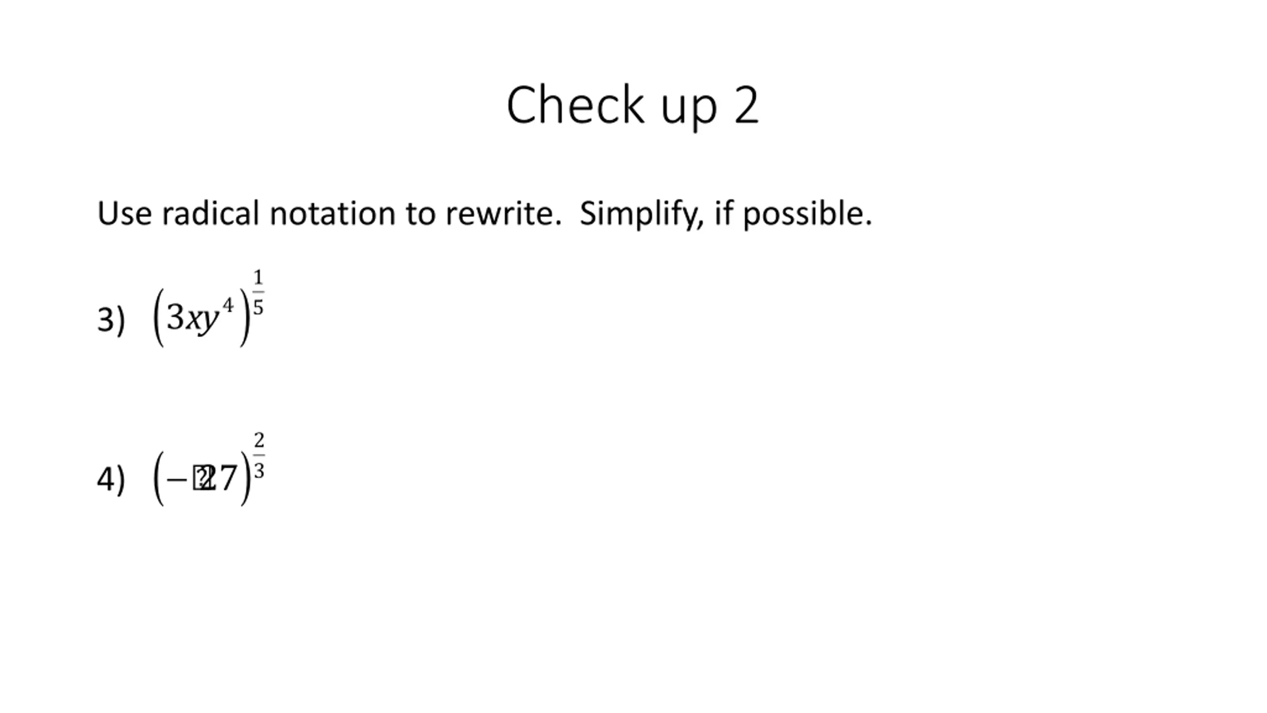 Check up 2 Use radical notation to rewrite. Simplify, if possible. 1 5 ( ) 3xy4 3) 2 3 ( ) -? 27 4)