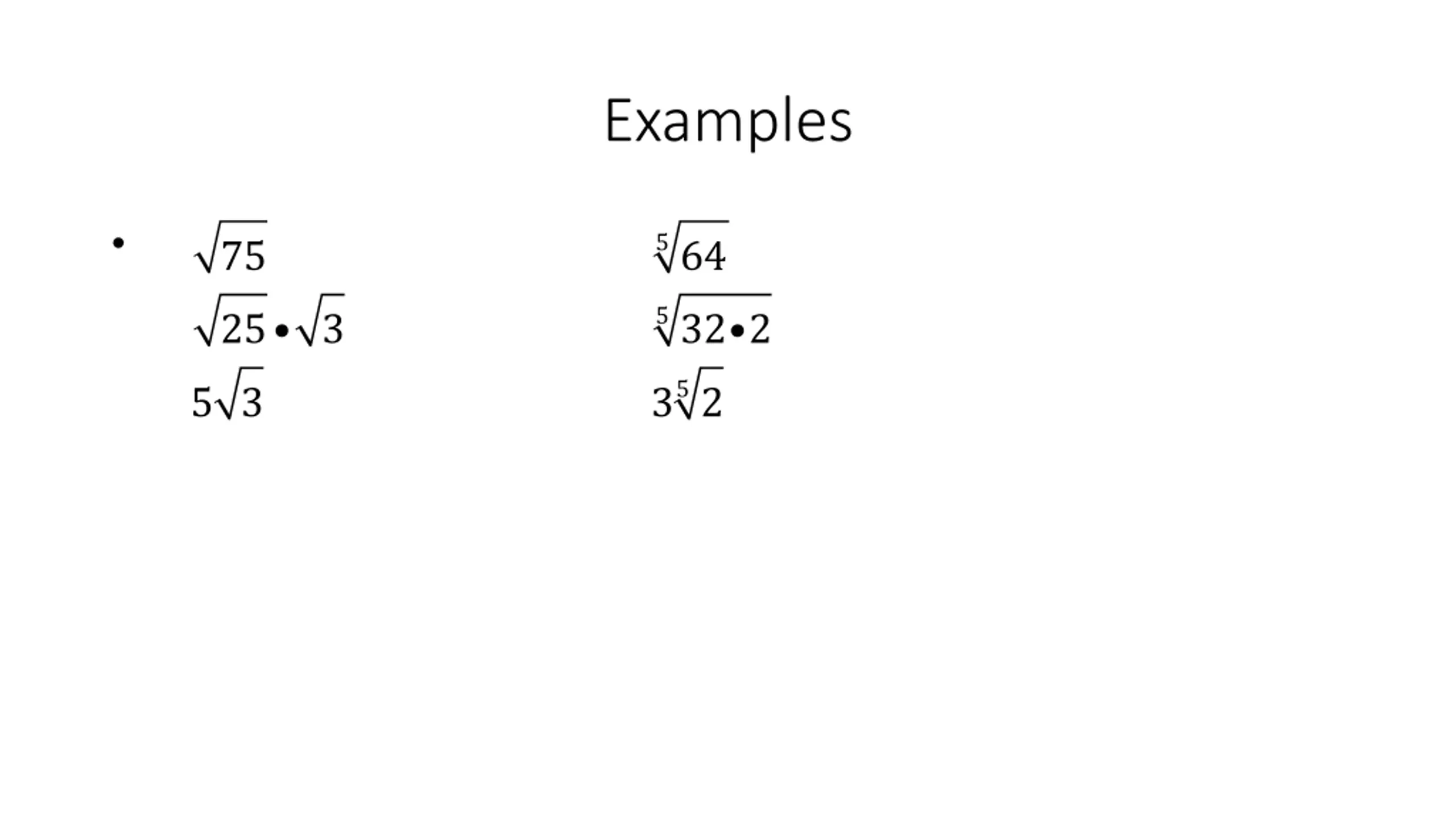 Product Rule for Radicals If and are real numbers, then a b = ab n n n n n a b Example: 3 7 3 7 21