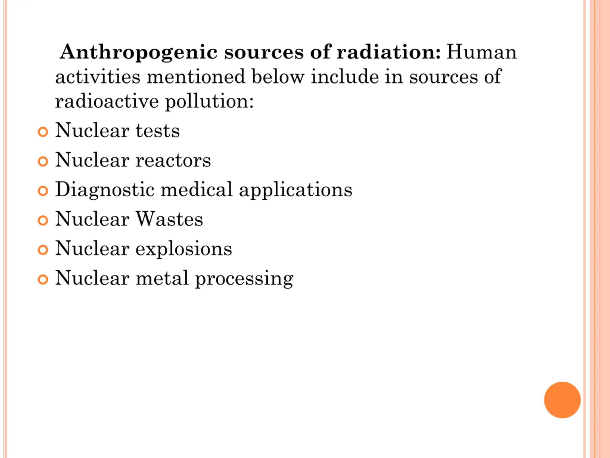 Anthropogenic sources of radiation: Human activities mentioned below include in sources of radioactive pollution: Nuclear tests Nuclear reactors Diagnostic medical applications Nuclear Wastes Nuclear explosions Nuclear metal processing