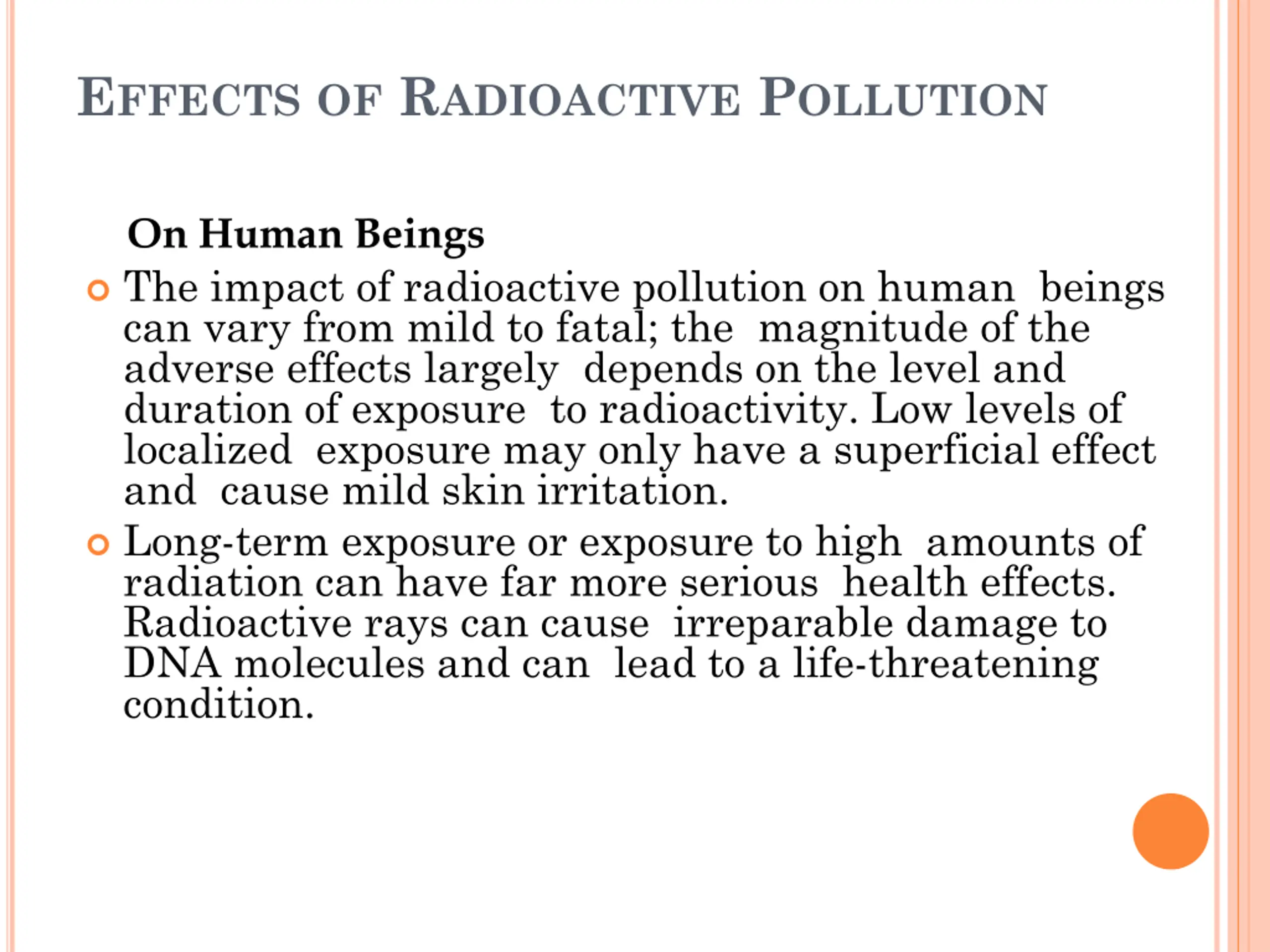 EFFECTSOF RADIOACTIVE POLLUTION On Human Beings The impact of radioactive pollution on human beings can vary from mild to fatal; the magnitude of the adverse effects largely depends on the level and duration of exposure to radioactivity. Low levels of localized exposure may only have a superficial effect and cause mild skin irritation. Long-term exposure or exposure to high amounts of radiation can have far more serious health effects. Radioactive rays can cause irreparable damage to DNA molecules and can lead to a life-threatening condition.