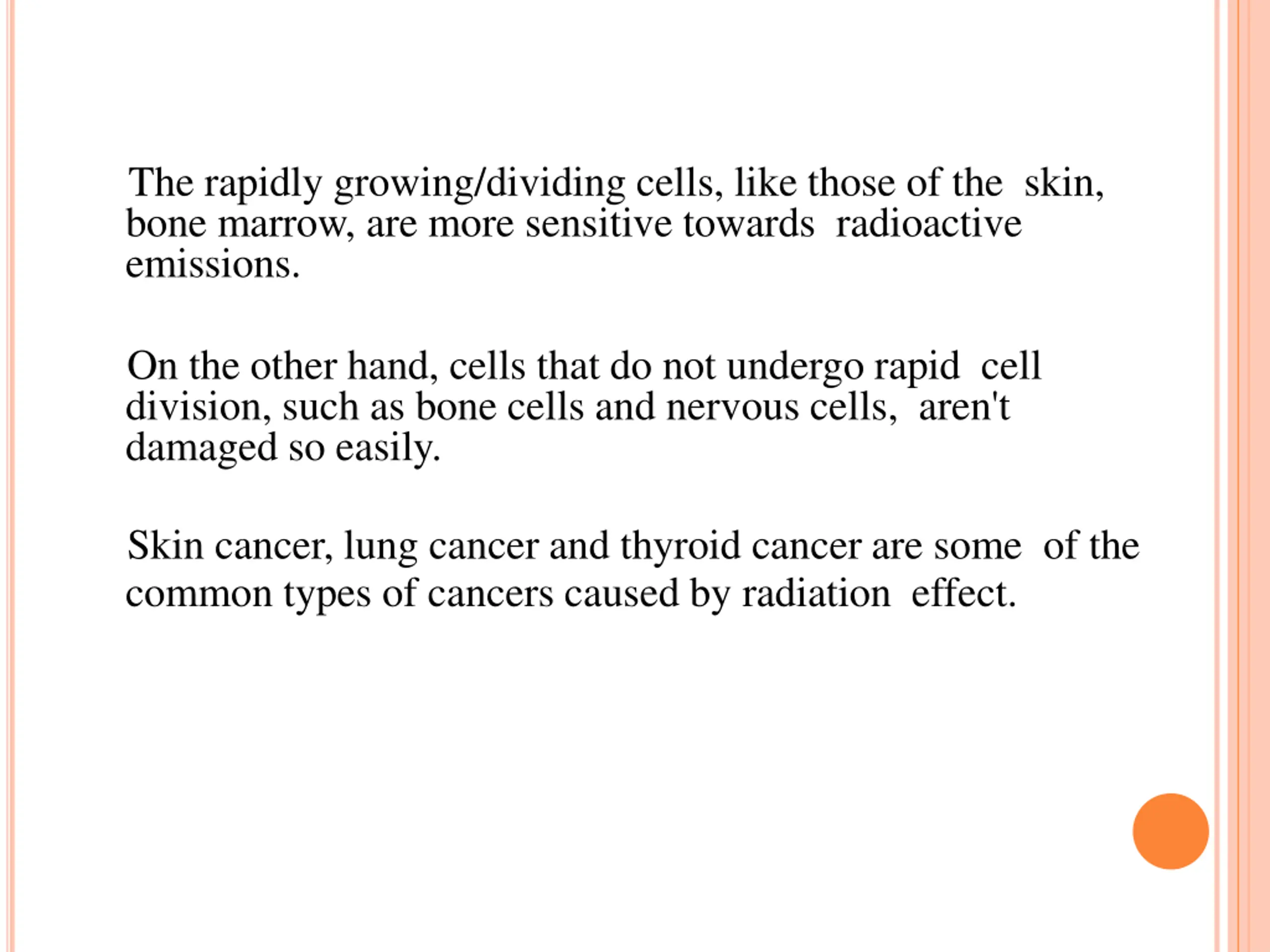 The rapidly growing/dividing cells, like those of the skin, bone marrow, are more sensitive towards radioactive emissions. On the other hand, cells that do not undergo rapid cell division, such as bone cells and nervous cells, aren't damaged so easily. Skin cancer, lung cancer and thyroid cancer are some of the common types of cancers caused by radiation effect.