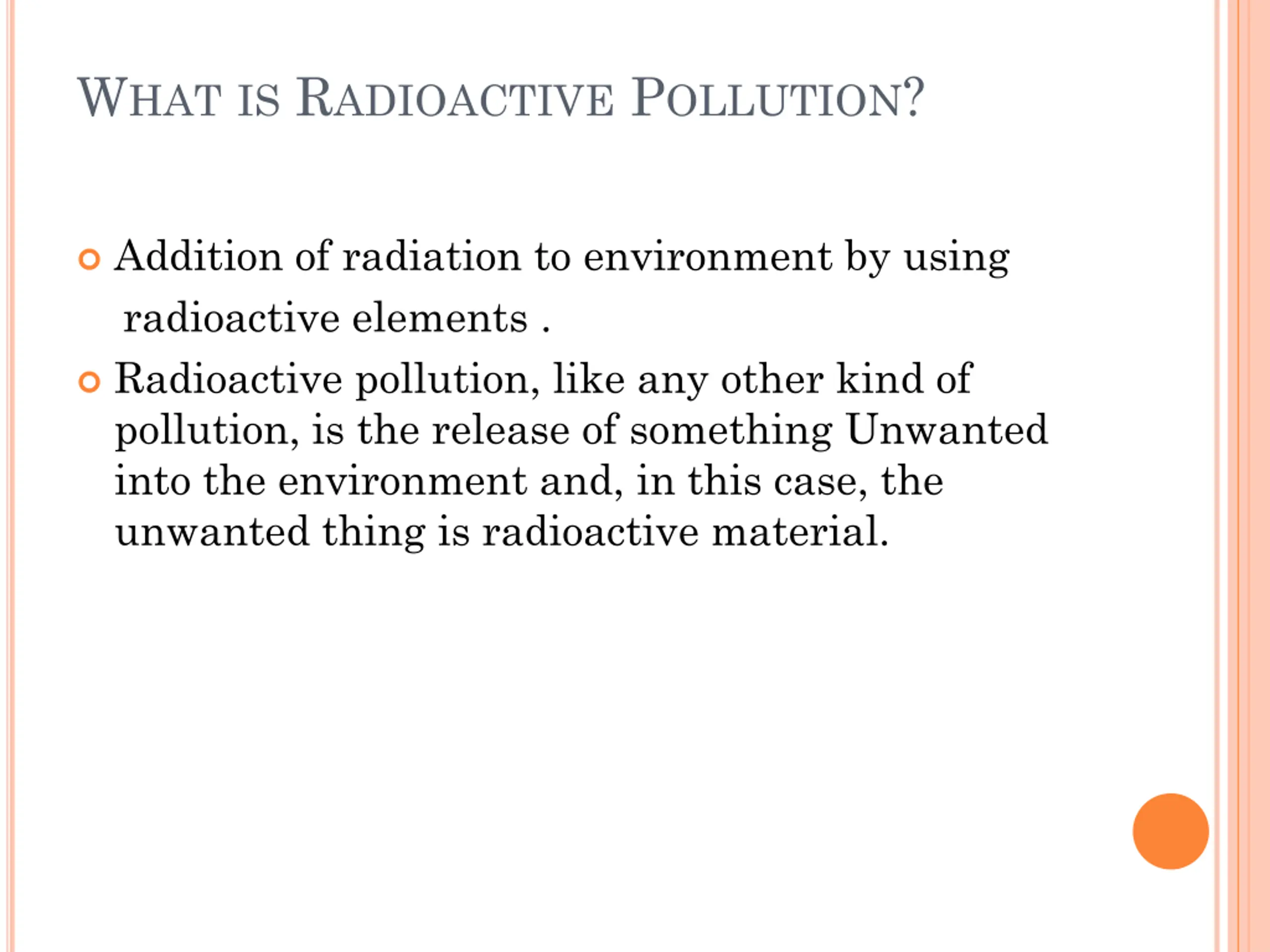 WHATIS RADIOACTIVE POLLUTION? Addition of radiation to environment by using radioactive elements . Radioactive pollution, like any other kind of pollution, is the release of something Unwanted into the environment and, in this case, the unwanted thing is radioactive material.