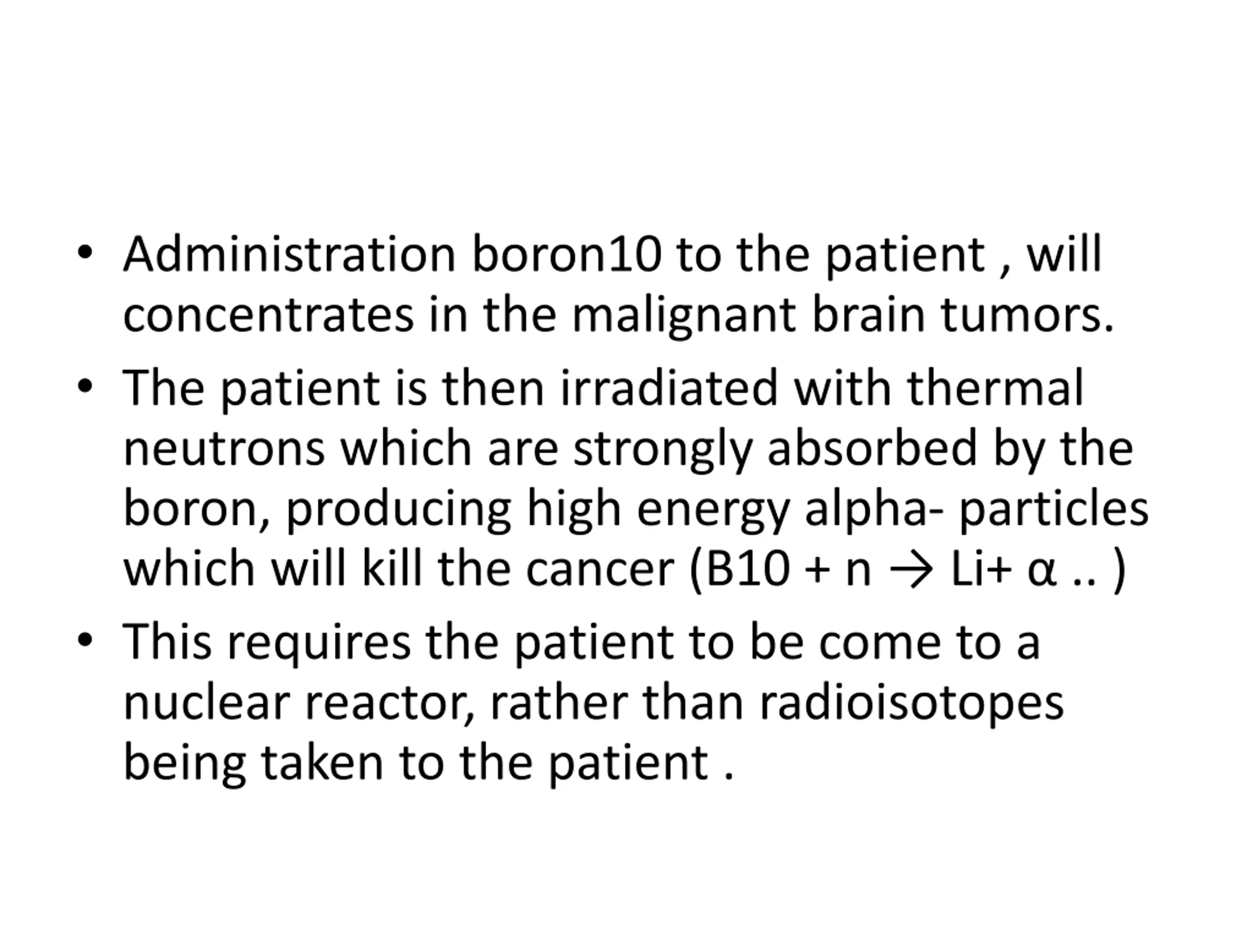 Administration boron10 to the patient , will concentrates in the malignant brain tumors. The patient is then irradiated with thermal neutrons which are strongly absorbed by the boron, producing high energy alpha- particles which will kill the cancer (B10 + n Li+ .. ) This requires the patient to be come to a nuclear reactor, rather than radioisotopes being taken to the patient .